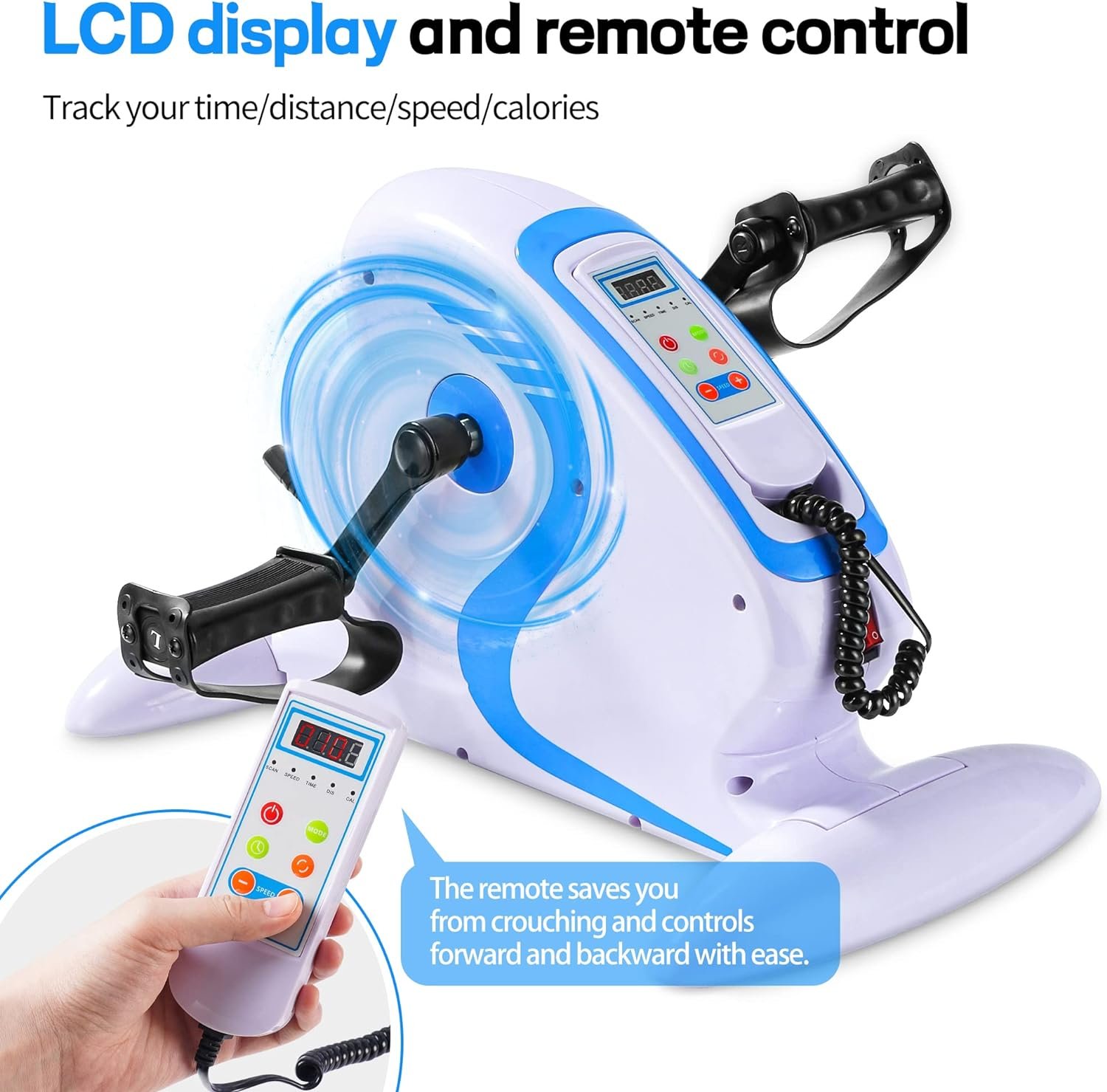 REMOTE CONTROL :The remote’s 6-level adjustable speed saves you from crouching. Four rubber anti-skid feet prevent slipping. Passive Mode: You can also select the Passive Motor (Off) option to make the pedals 100% manual. The multifunctional LCD display on this mini pedal exerciser is easy to read and tracks your time/distance/speed/calories as you ride.