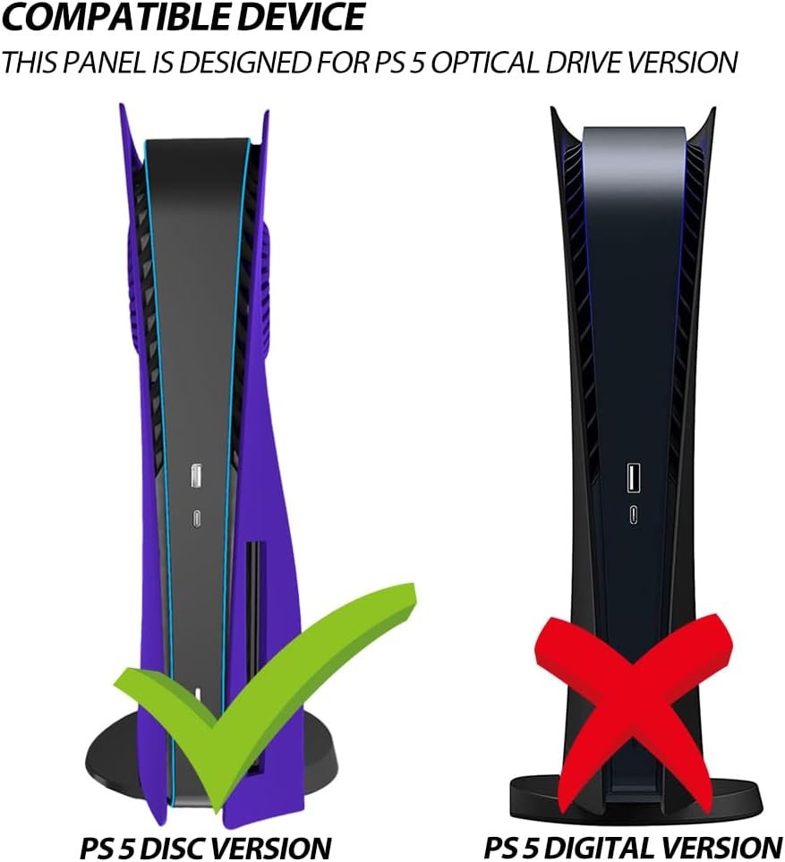 【Easy Installation】: Everyone can replace this PS5 faceplate quickly and easily: ①Lift under the rear corner of the protective cover where the PS5 logo is located, release the circular buckle. ②Push the cover down toward the bottom of the console, the cover will slide off. ③To install new plate, line of up the plate to the console vertically, hold the top of the console and push the plate up to lock in the plate.