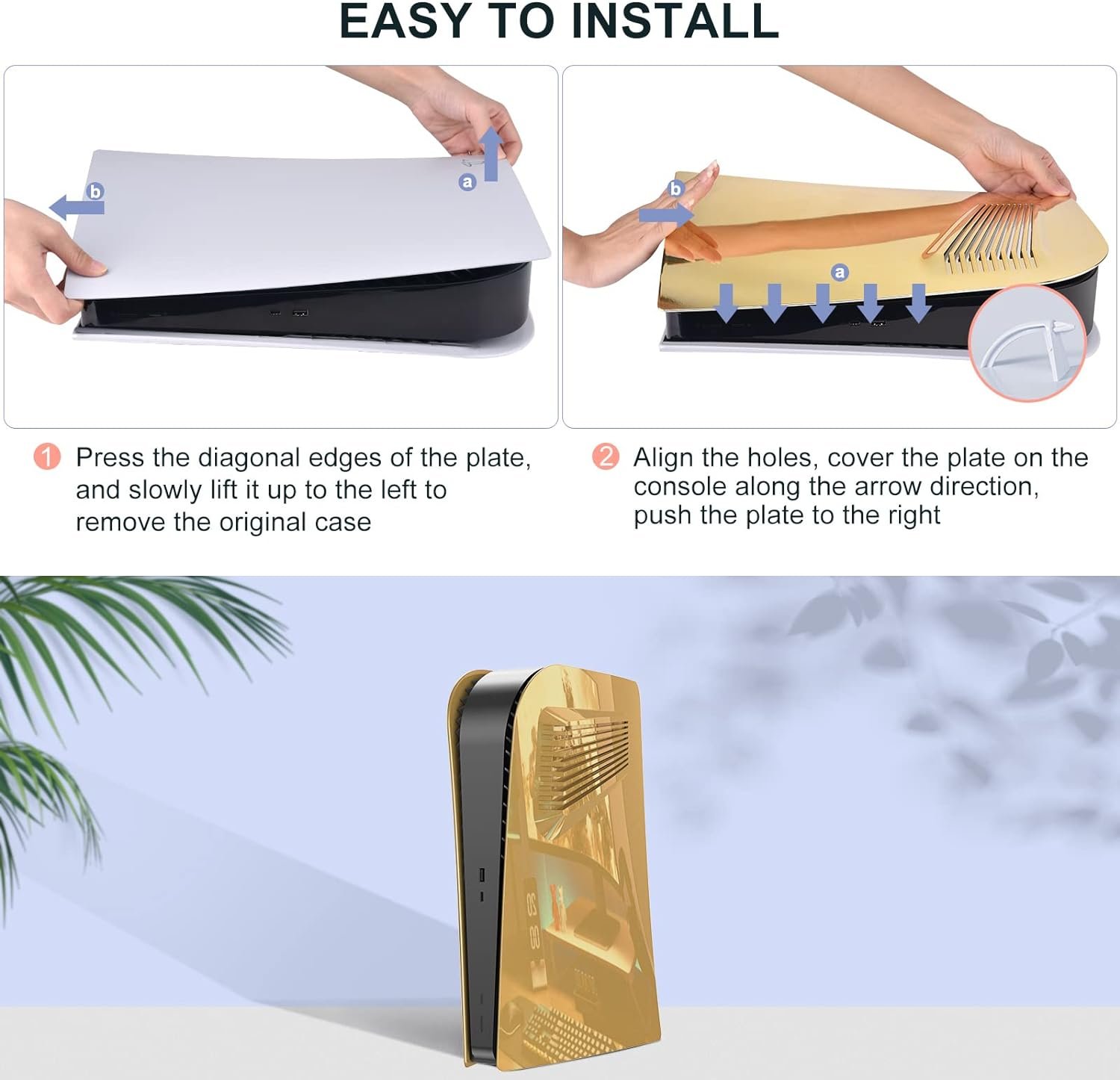 【Easy to Install and Remove】- Easily install or disassemble faceplate for PS5. First, lay the console flat. Secondly, press the diagonal edges of the plate, and slowly lift it up to the left to remove the original case. Then align the holes, cover our plate on the console along the arrow direction. Finally, push the plate to the right. Once hearing a click, indicating successful installation