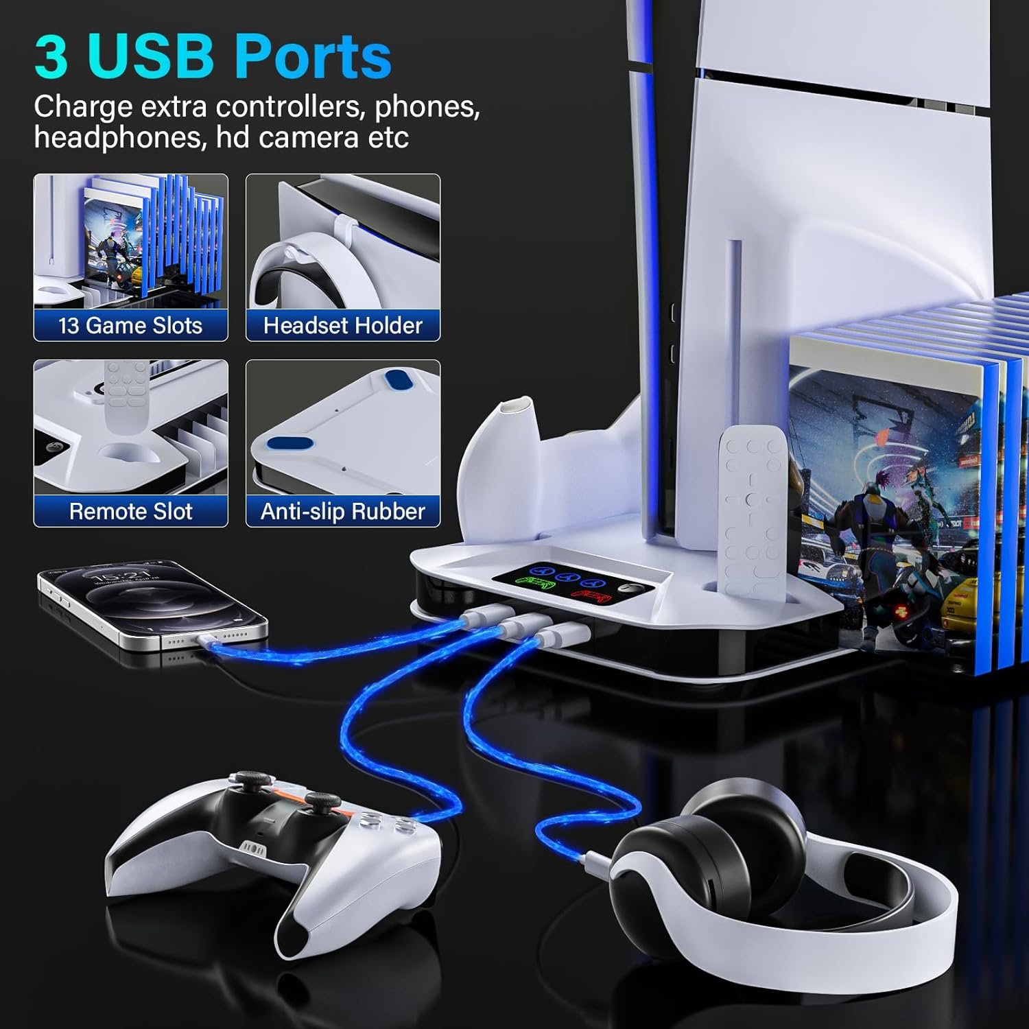 š ćPLAYSTATION 5 SLIM STAND – MULTI-FUNCTIONAL PS5 GAMING ACCESSORIESćAny ps5 game players would not place the ps5 console and the related accessories randomly. This device is multifunctional, it can protect your 2020/2023 ps5 console disc & digital edition and official ps5 controllers. Ths PS5 slim cooling stand sort out ps5 gaming accessories, making them easy to reach. In this way you can keep your place organized and tidy. It includes extra usb hubs that are convenient for gamer who charging different device simultaneously