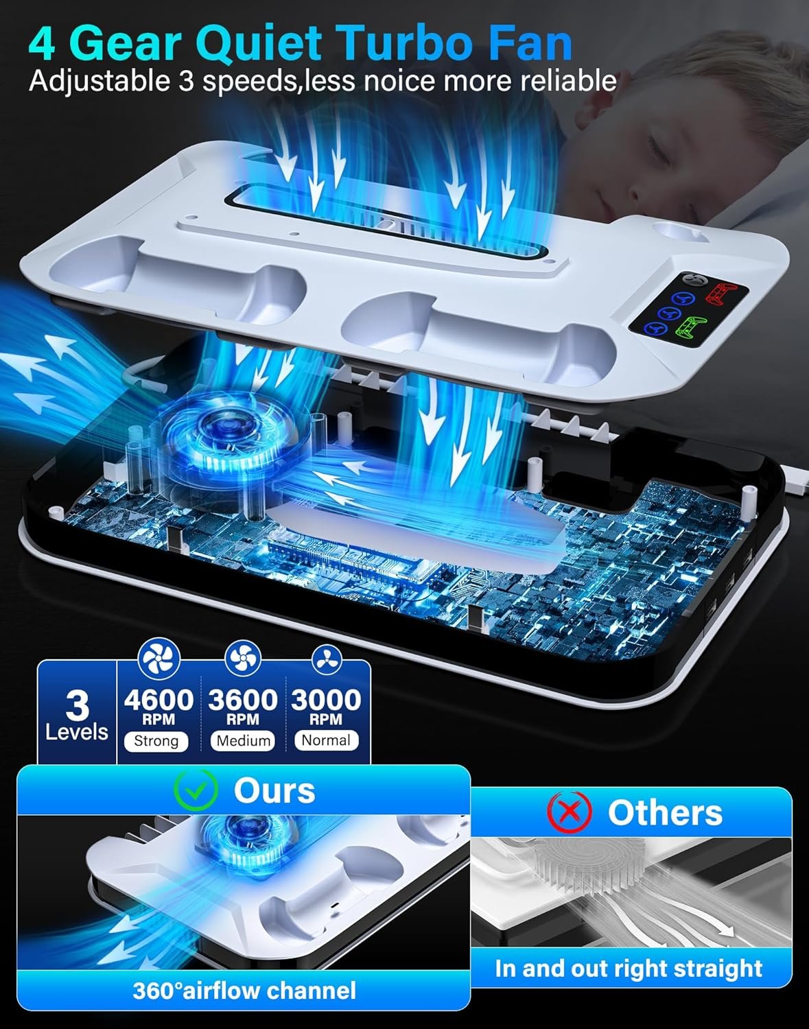 šćUlTRA QUIET COOLING STATION FOR PS5/ PS5 SLIM CONSOLEćThe ps5 cooler stand fits both the 2020 Playstation 5 console and the 2023 PS5 Disc and Digital edition (which has a dividing line in the middle of the body, and the public call it slim version). The PS5 slim stand has a updated & enlarged 4 gear quiet turbo fan with 3 speeds(Max speed up to 4600RPM, noise lower than 36db), enhancing air circulation and heat dissipating inside the console.In this way it efficiently prevent overheating issues without you noticing it, at the same time maximize the ps5 console lifespan. So even for long gaming time, the ps5 cooling system will always give you a peace of mind