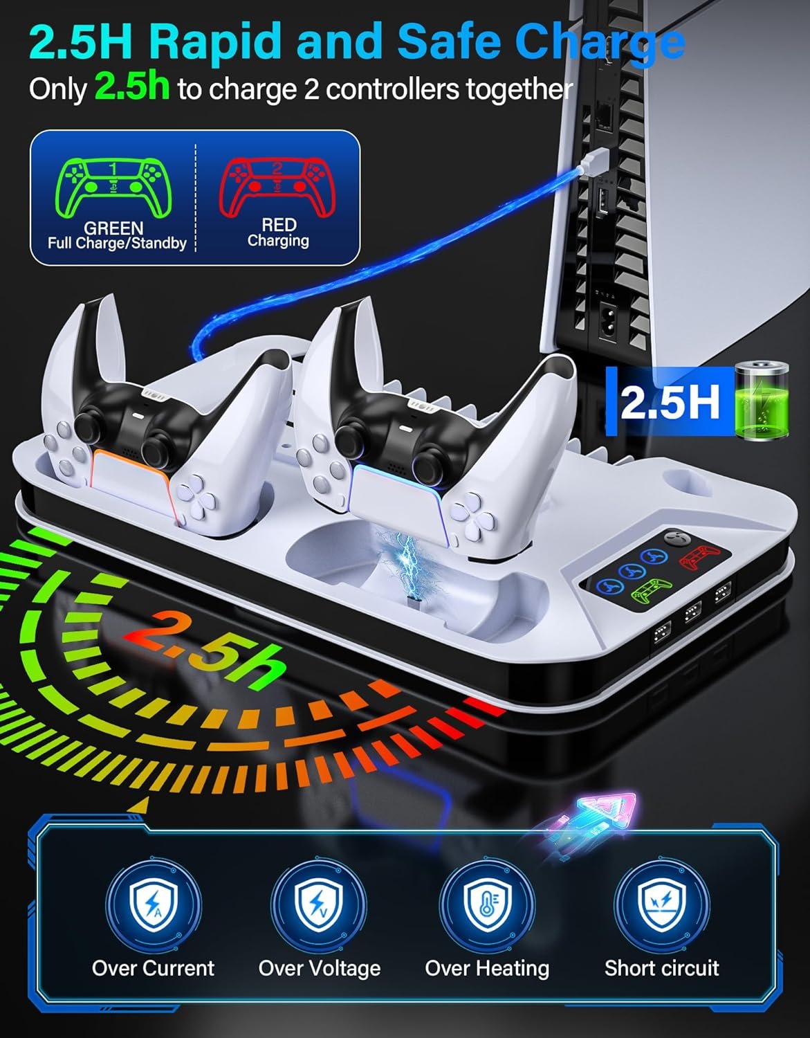 š ć2.5H PS5 CONTROLLER SAFT & FAST CHARGING with INDICATORćThe ps5 cooling and controller charger station can fully charge both 2 PS5 Dualsense controllers within 2.5HRS. The large LED indicators clearly shows the charging status, i.e. green for full charge, red for charging or standby. Per thousands of pull test, the updated usb c interface is not easy to break.The alum material ensures great contact. The built-in smart chip prevents charing issues including overcharging, overheating, overvoltage, overcurrent, short circuit. The ps5 light up stand prolongs the controller battery life. ššNot for ps5 dualsense edge controller