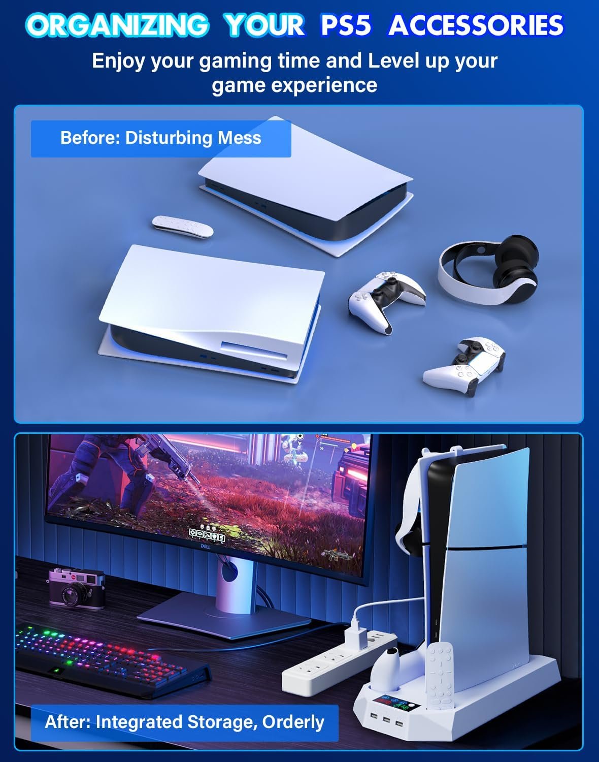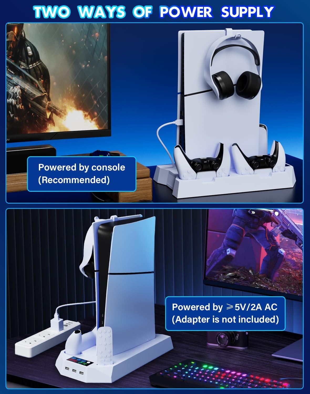 🔋【Dual Charging Station for Playstation 5 Controllers】This ps5 stand supports powered by ps5 console(Recommended) and AC adapters(≥5V/2A). The playstation 5 cooling stand with controller charger simultaneously supports charging for 2 PS5 controllers, get a full charged within 3 hours. The charging status can be clearly read from the LED indicators.Red–charging; Green–fully charged or /no controller. It will stop charging by a battery volume of 80% due to the built-in automatic protective chip of the PS5 Controller. (𝐖𝐚𝐫𝐦 𝐓𝐢𝐩𝐬:The ps5 console stand does NOT Fit ps5 edge controller!)