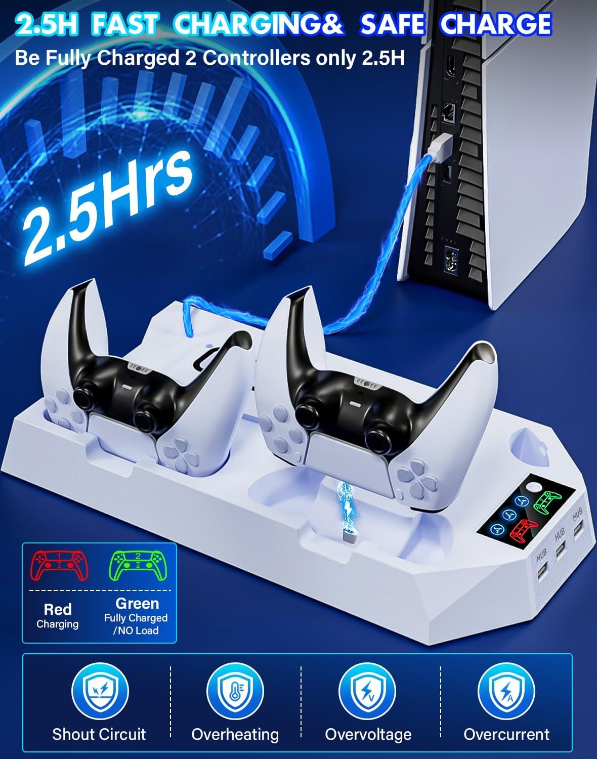 ❄️【Overcharge Protection for PS5 Base Stand】ps5 charging stand adopted intelligent circuit protection chip,the ps5 stand and cooling station with dual controller charging protects ps5 controllers from overcharging, overheating, overcurrent, overvoltage and short circuits, reliable ps5 portable gaming station,ensuring the health of your PS5 controller’s battery and extending its lifespan.