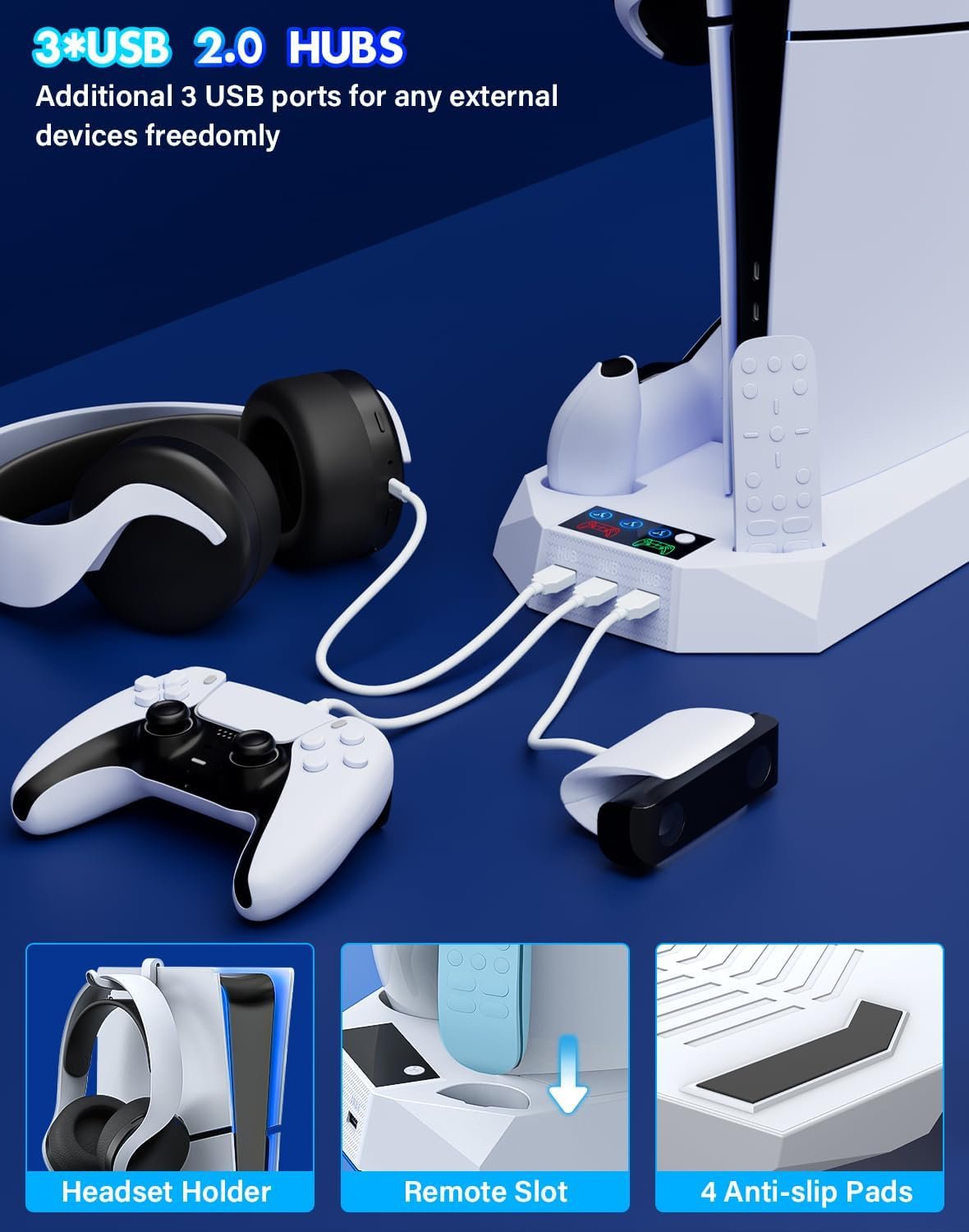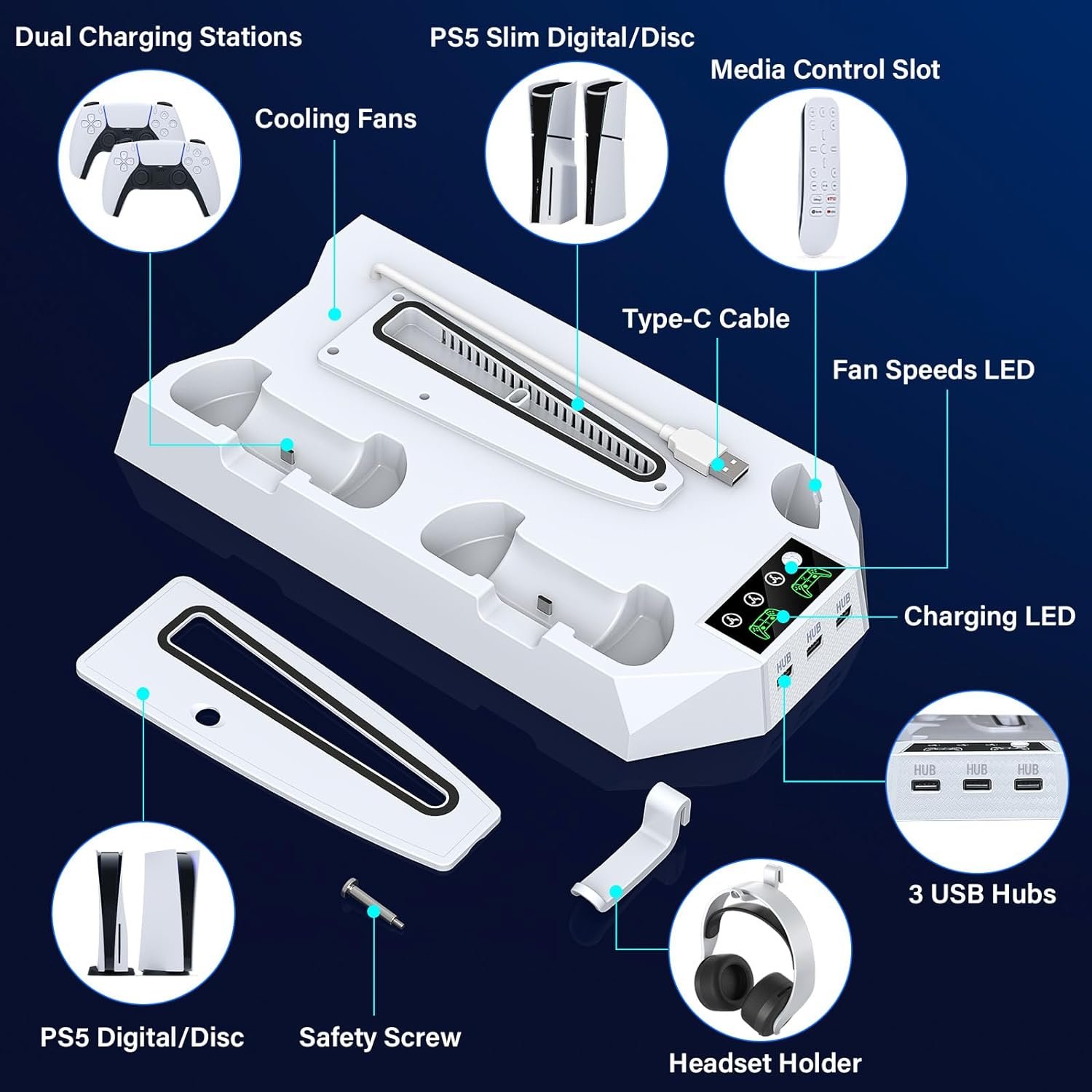 ❄️【Multifunctional All-in-One PS5 Docking Station】The ps5 docking station with cooling fan provides 3 extra USB2.0 ports for connecting wired controllers, headsets, mice, tablets, and more to expand your console’s capabilities. Also provides a ps5 headset holder and a ps5 media remote slot,making it an ideal replacement for the official Sony playstation 5 stand.This playstation 5 slim console charging dock with ps5 controller charging station helps well organize ps5 accessories in one place and save your space. The accessories for PS5 console is an ideal Christmas or birthday gifts for families and friends.