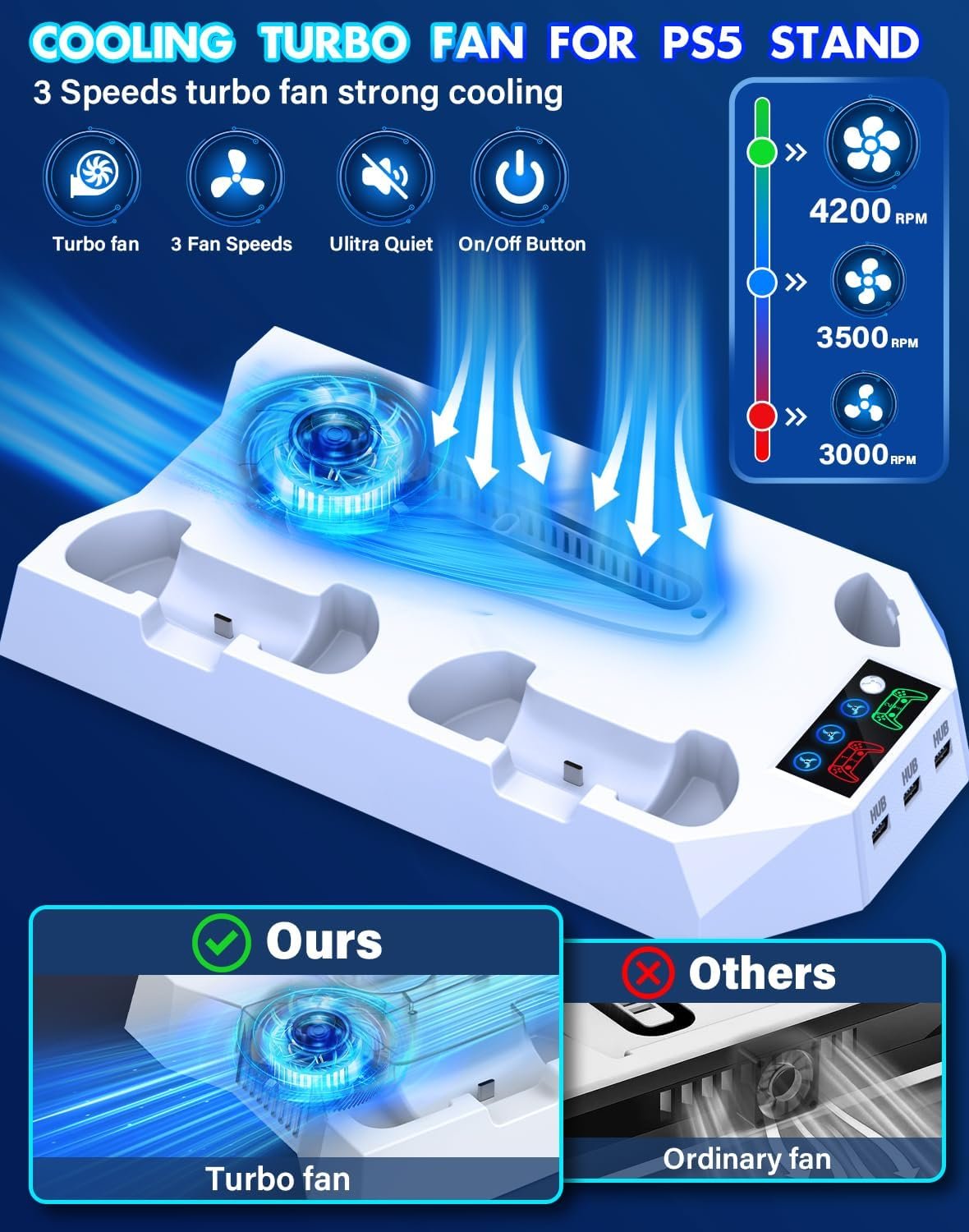 ❄️【PS5 Vertical Stand with 3 Adjustable Turbo Cooling Fan】The PS5 stand vertical built-in large turbo cooling fan . This playstation 5 vertical stand has efficient cooling system with low-noise and has one-button adjustment, offers three levels of wind speed (Normal,Medium,Strong). Greatly improve the cooling efficiency and cool down your ps5 console by dissipating the heated air from the bottom of console even during long play sessions. It enhances air circulation, effectively blows away hot air from the bottom of your PS5 console, ensuring constant PS5 console cooling and protecting the console, improving gaming experience.