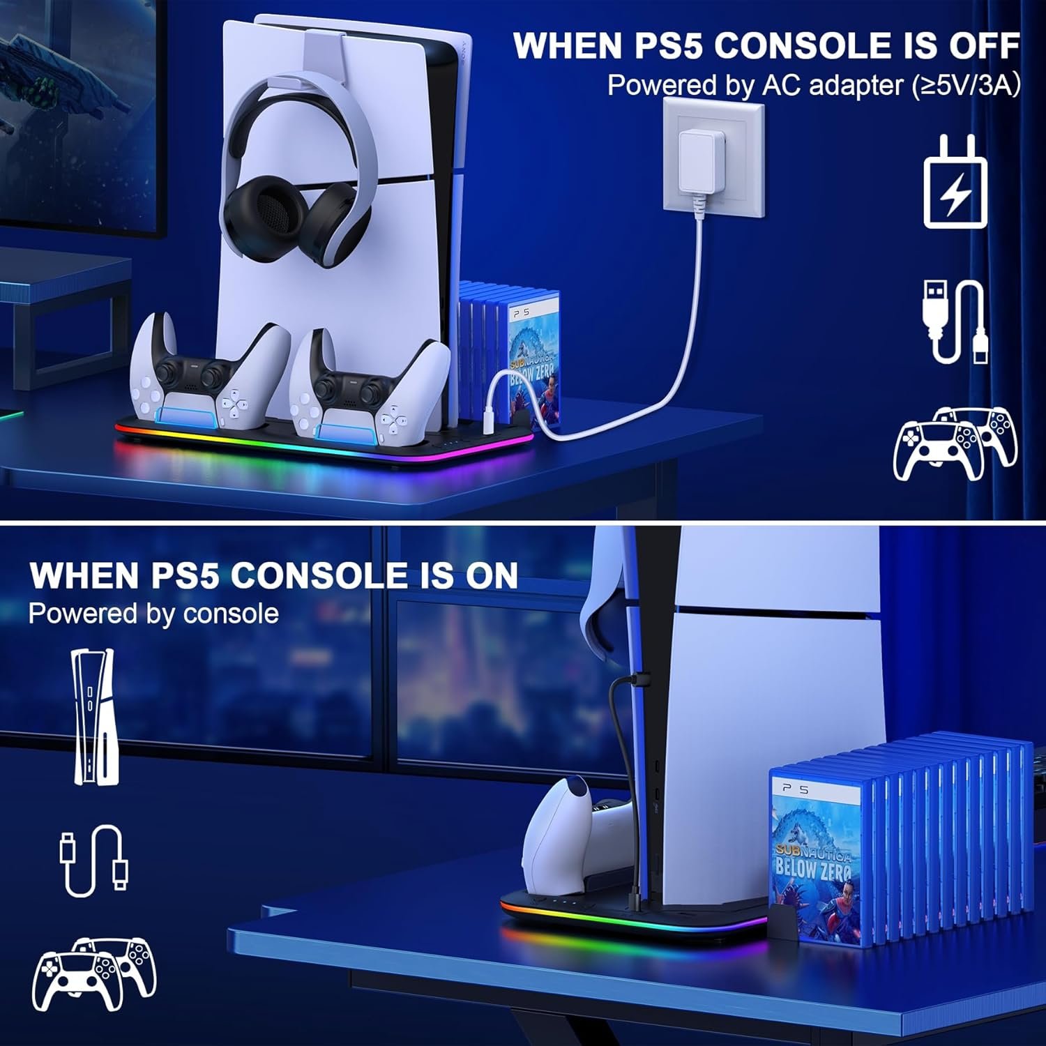 🌀 【AN IDEAL PS5 ACCESSORIES】 PS5 station is perfectly compatible with PS5 Slim/Dualsense controller/Digital/Disc console. PS5 holder has an extra USB port, which allows to charge other devices like mouse, keyboard, headset,phone etc.. With a sleek and tidy design, PS5 accessories bundle saves much space to keep your all ps5 assecories like console, 2 controllers, 15 game discs, headset organized. Your must-have PS5 organizer!