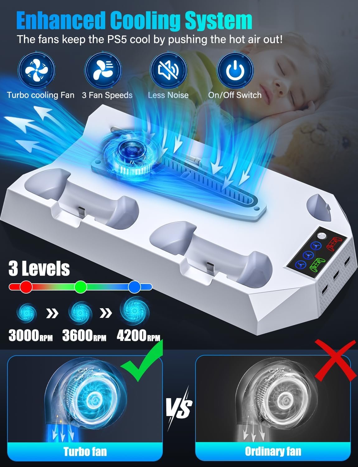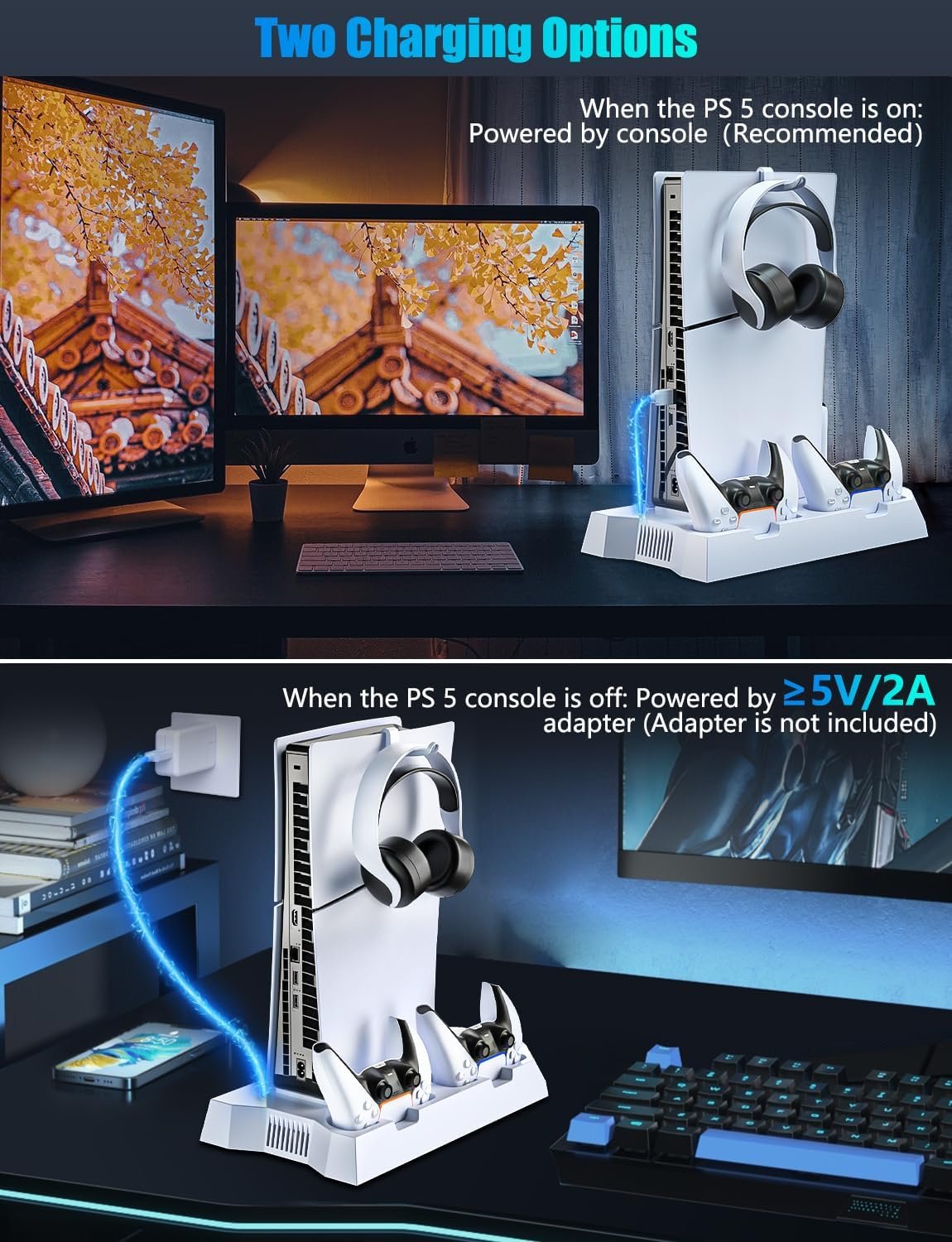 🔋Dual Fast PS5 Controller Chargers & Clear LED Indicators: The PS5 Slim cooling station can fully charge 2 PS5 controllers in only about 3 hours. Clear LED indicators of PS5 charging station. Red light: charging; Green light: fully charged/standby. The PS5 controller charging station has a built-in smart protection chip to prevent overcharging and ensure the safety of your device. The PS5 charging station can both charge the PS 5 controller and store the controller when not in use, saving time and keeping it tidy. (NOTE: Not fit PS5 DualSense Edge controller )