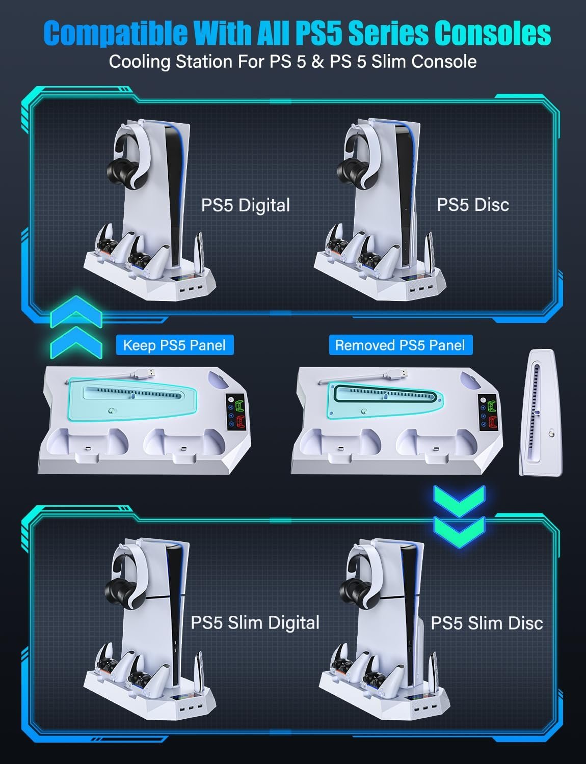 🌊Cooling Stand for PS5 & PS5 Slim Disc/Digital Version: The PS5 cooling stand is suitable for all the new PS5 Slim Disc/Digital Console and PS5 Disc/Digital Console. PS5 Console needs the panel (Factory Setting: PS 5 panel is fixed on the PS5 stand) PS5 Slim Console does not need the panel and should be removed during installation. The PS5 Slim stand is equipped with 1 safety screw to secure the PS 5 console to the PS cooling station, non-slip silicone feet on the bottom make the stand more stable on the desktop.