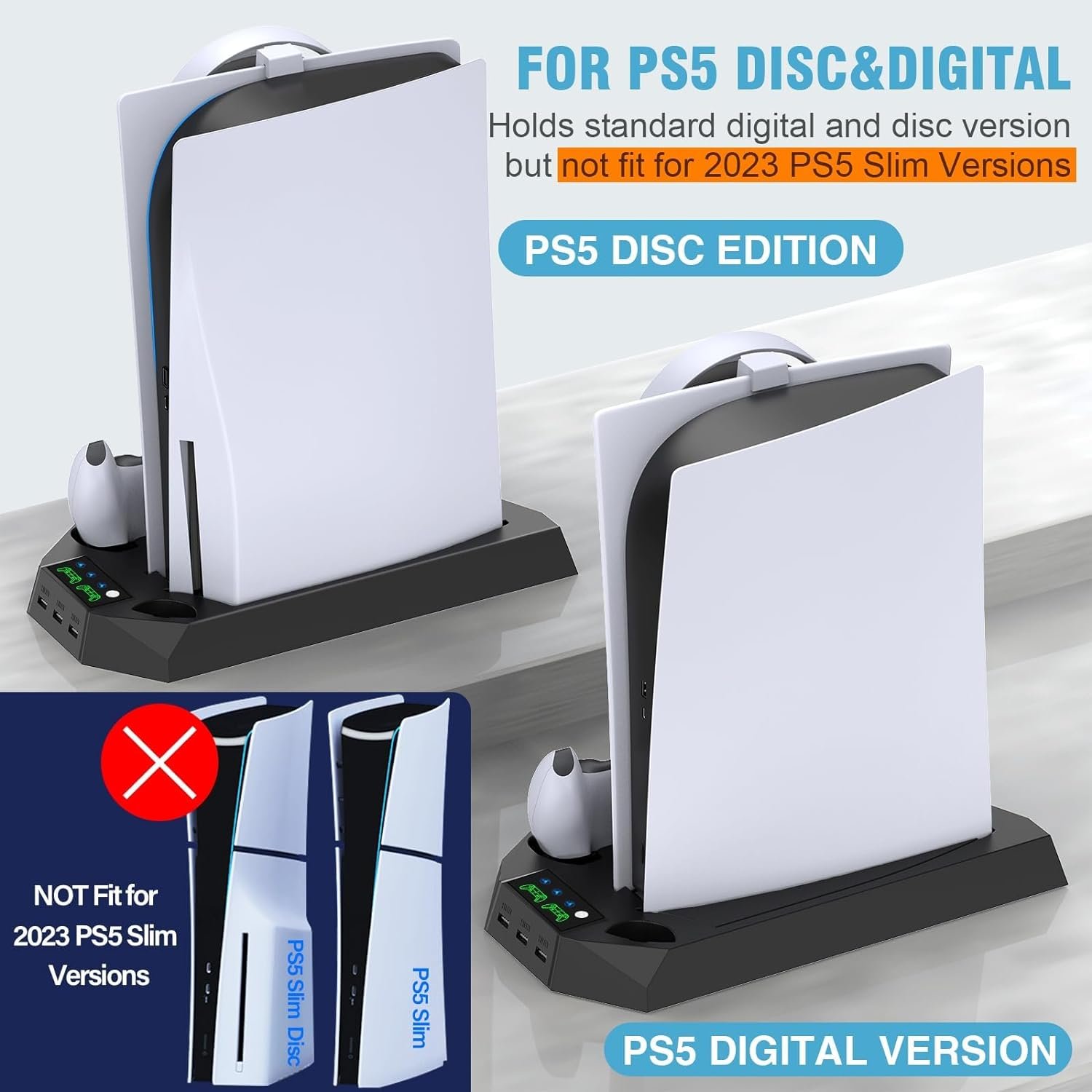 đ’…’COMPATIBLE WITH PS5 DISC&PS5 DIGITAL VERSION:This ps5 controller stand took into consideration both ps5 console digital edition as ps5 console disc version, also comes with a special digital strip for smaller ps5 digital console and a safety screw, both will make the docking station more secure and balanced.