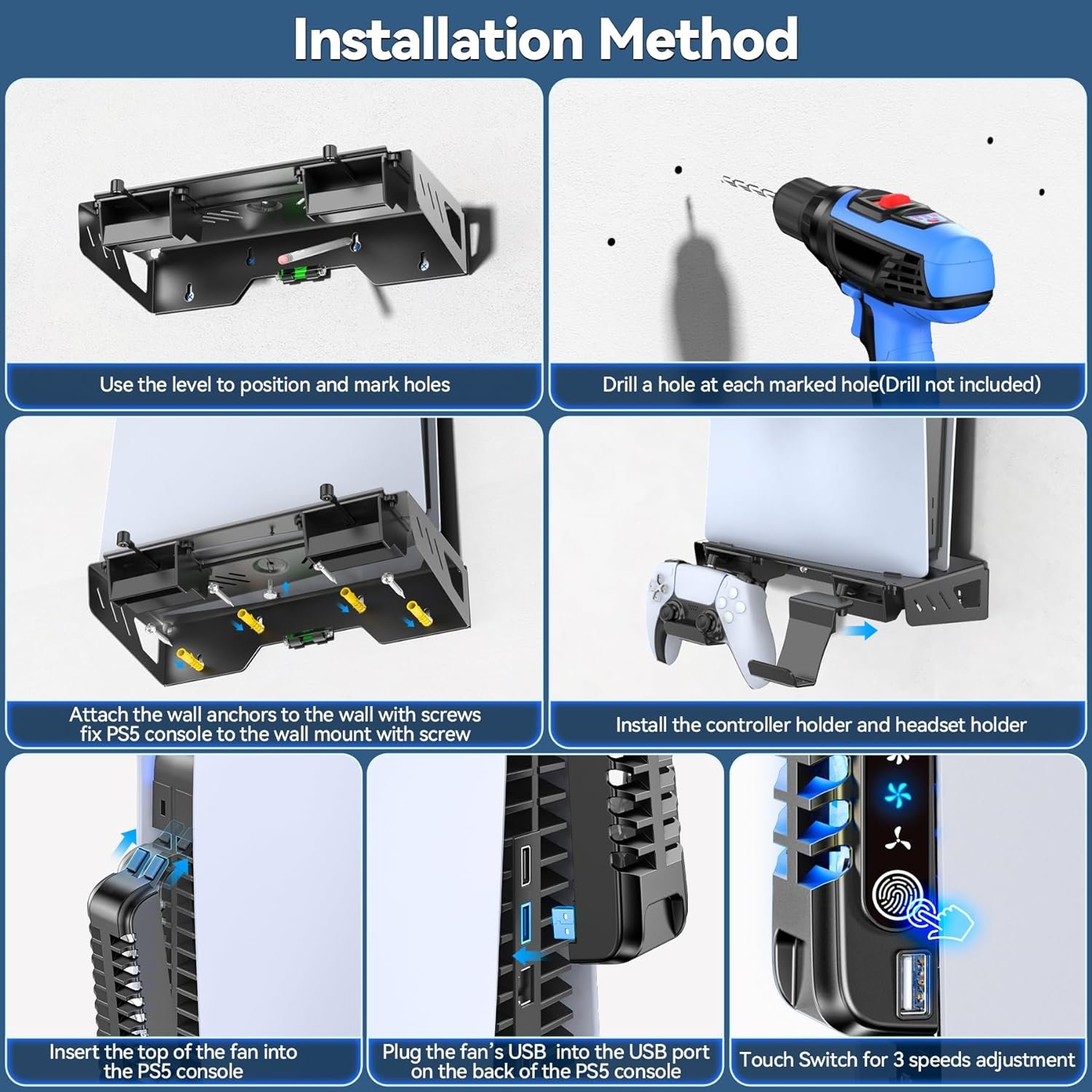 💠【Complete Installation PS5 Accessories】In addition to the stable metal material, PS5 mount kit with cooling fan and controller charging station includes spirit level and 4 wall anchor screws. With spirit level, it can avoid tilting and better positioning to mark holes that make it more convenient during installation. Please noted that it need drill a hole, but drill is not included.
