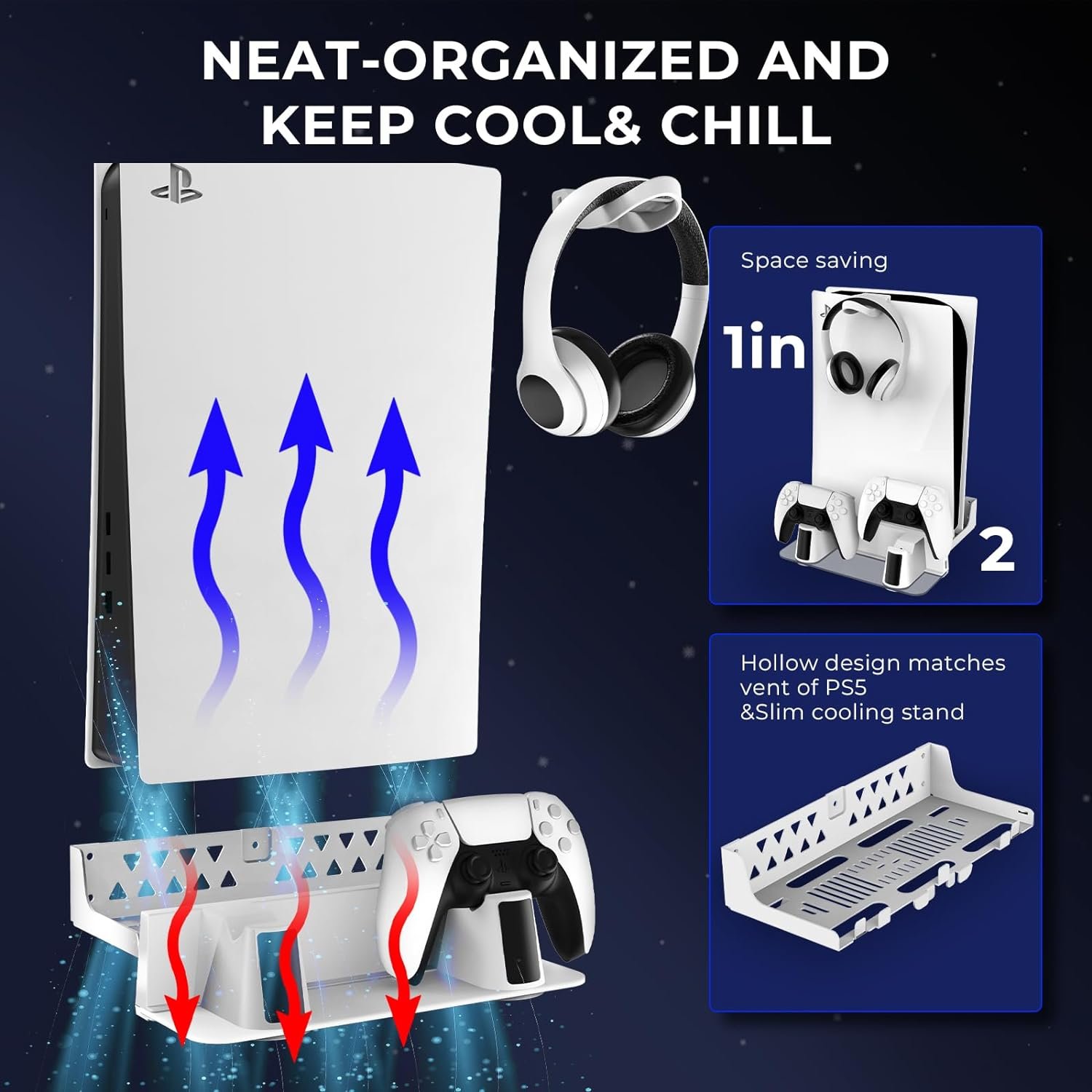 【SPACE SAVING & HEAT DISSIPATION DESIGN】The PS5 wall mount bracket stand mounts your PlayStation 5, controller and headphone high up, not only free up more space for the desk, but also keeps things neat & organized all your Playstation 5 accessories. Hollow design matches vent of PS5 cooling stand perfectly which can provide all-round heat dissipation, which keeps your PS5/PS5 Slim cool and chill.