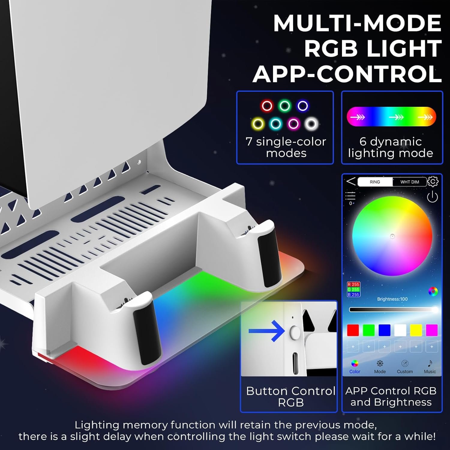【FAST CHARGING & MULTI-MODE RGB LIGHT】Our new PS5 wall mount fully charging your PS5 controllers in just 2.5 hours. Indicator lights show the charging status with orange for charging and blue for charging finished. Bluetooth APP customizable 7 single-color modes and 6 dynamic lighting modes to create a personalized gaming atmosphere as you wish.