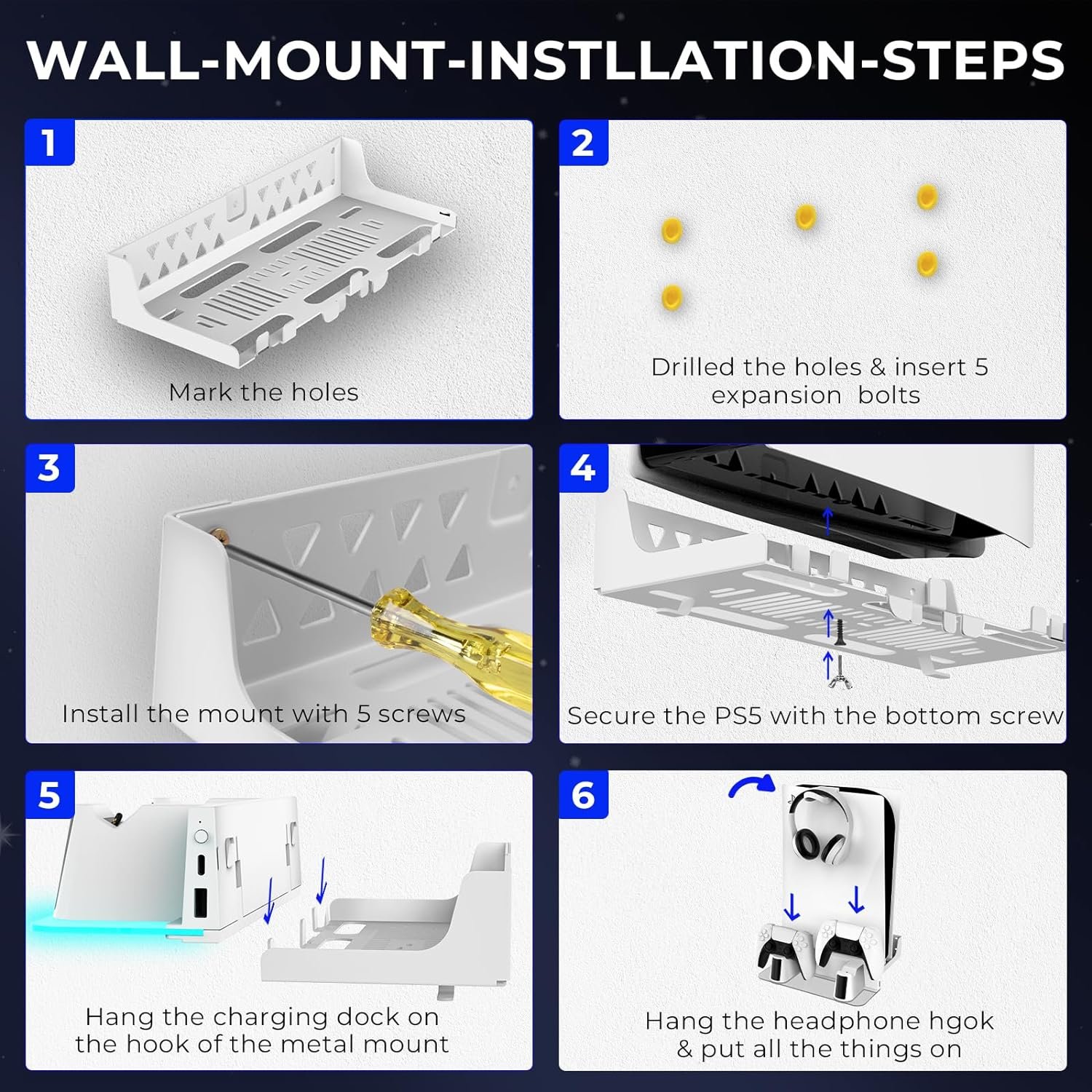 【INSTALLATION MANUAL & GIFT BOX PACKAGING】Exquisite gift box package comes with installation manual and accessories to help you easily to mount up. Your PS5 wall mount bracket shelf set includes: PS5 wall mount x 1, charging dock x 1, headphone hanger x 1, charging cable x1, safety lock x1, screw set x 6, screwdriver x 1, manual x1. Happy Games, Happy New Year!