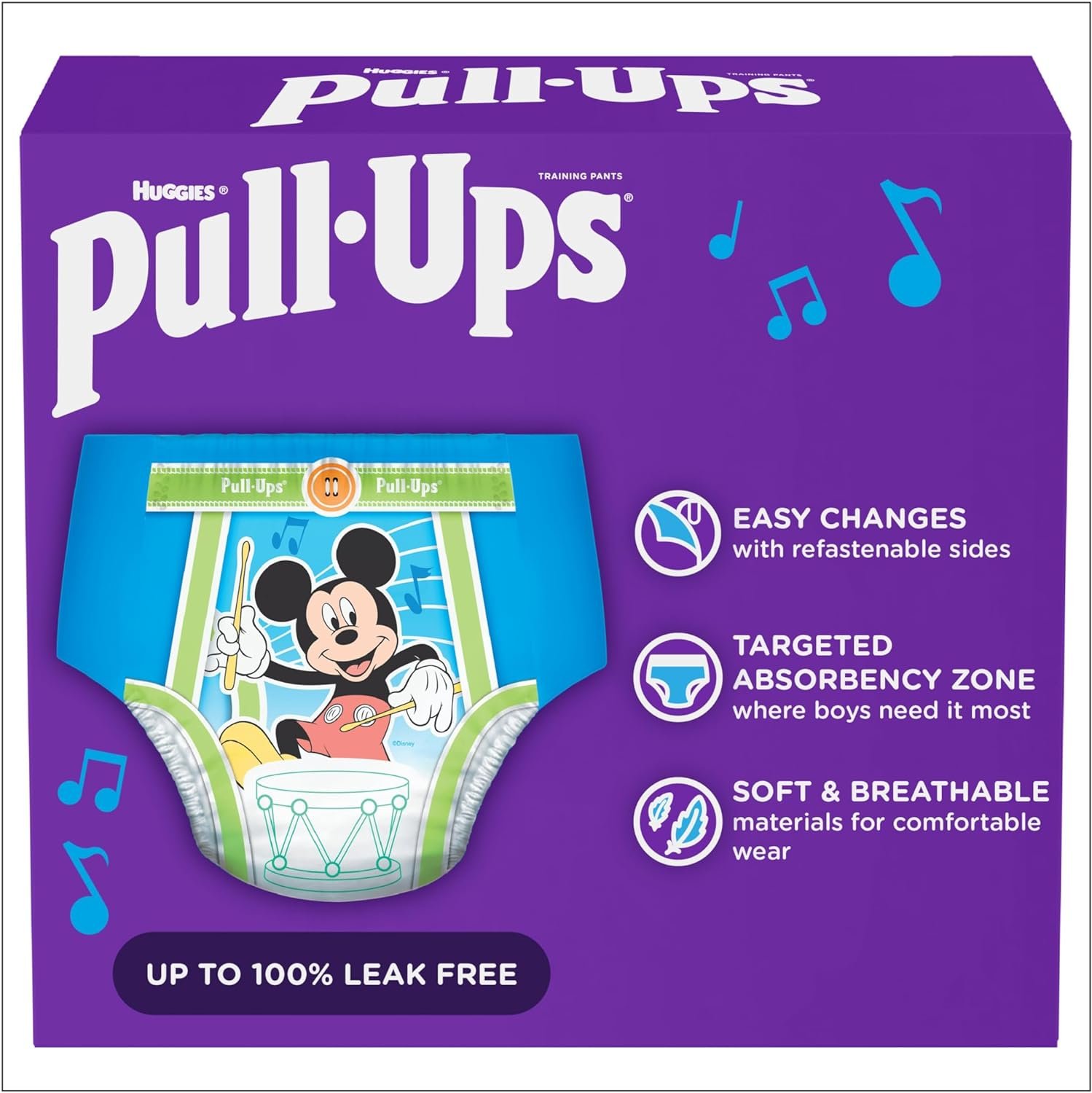Start potty training with Pull-Ups Training Pants for Boys! Each training underwear delivers easy changes with refastenable sides, allowing you to keep pants and shoes on your toddler. Pull-Ups Potty Training Pants feature up to 100% leak-free protection and targeted absorbency where boys need it most. Made with soft and breathable materials, these boys’ training pants are comfy and flexible, with an underwear-like fit to help make potty training easy. Not only do they provide all-around coverage, but are designed for little hands to easily pull up and down for Big Kid independence. Each pack includes two exclusive music designs featuring Disney’s Mickey Mouse, with instrument graphics that fade when wet to help motivate your child to stay dry. Making music with Mickey Mouse comes to life with interactive digital tools. When your child is ready to begin his potty training journey, the Pull-Ups brand can help. Visit the Pull-Ups website for expert potty training tips and resources. We’ve helped train 60 million Big Kids and counting!* Pull-Ups Boys’ Training Underwear are available in sizes 2T-3T (16-34 lbs), 3T-4T (32-40 lbs), 4T-5T (38-50 lbs) and 5T-6T (50+ lbs). (*US and CA)