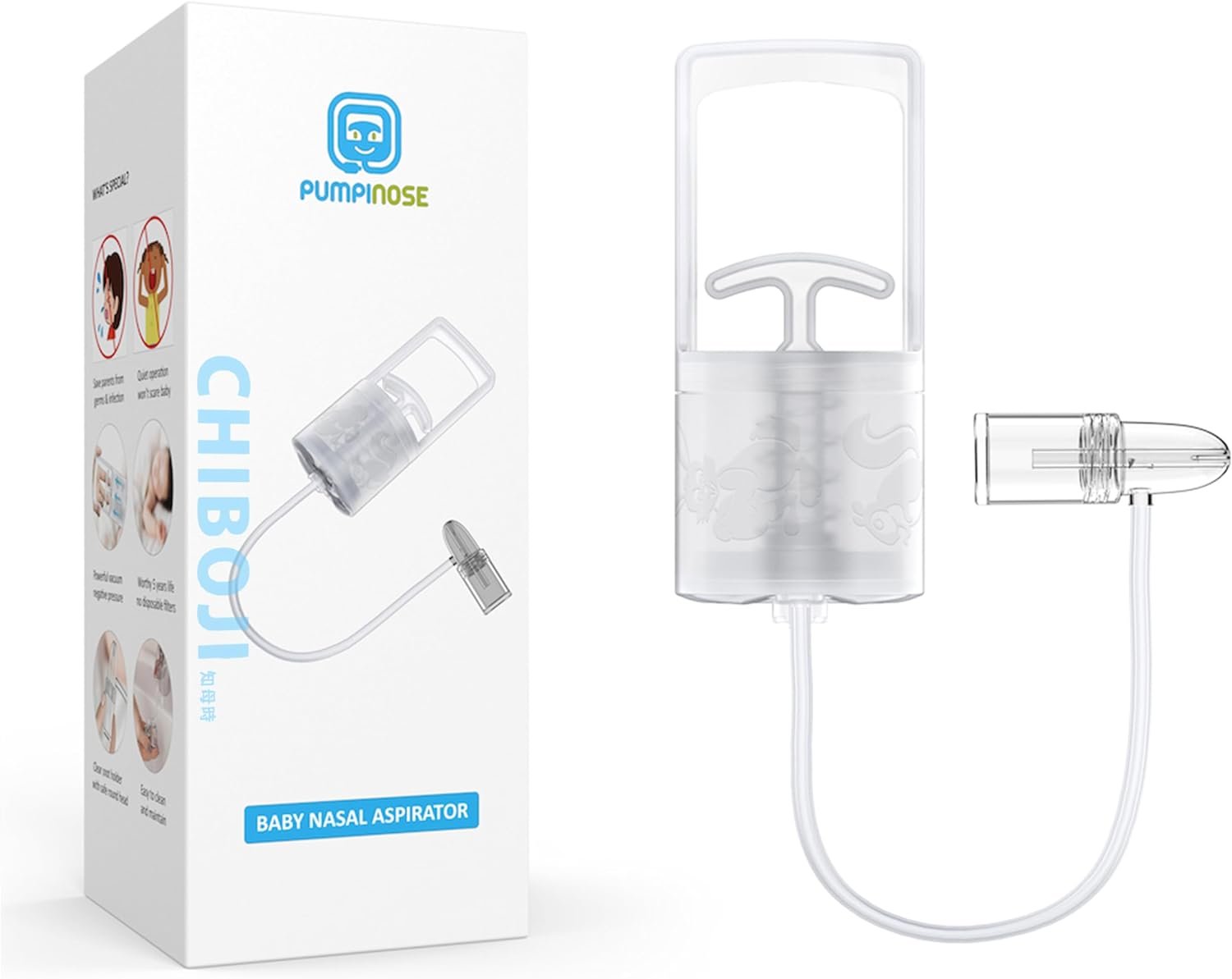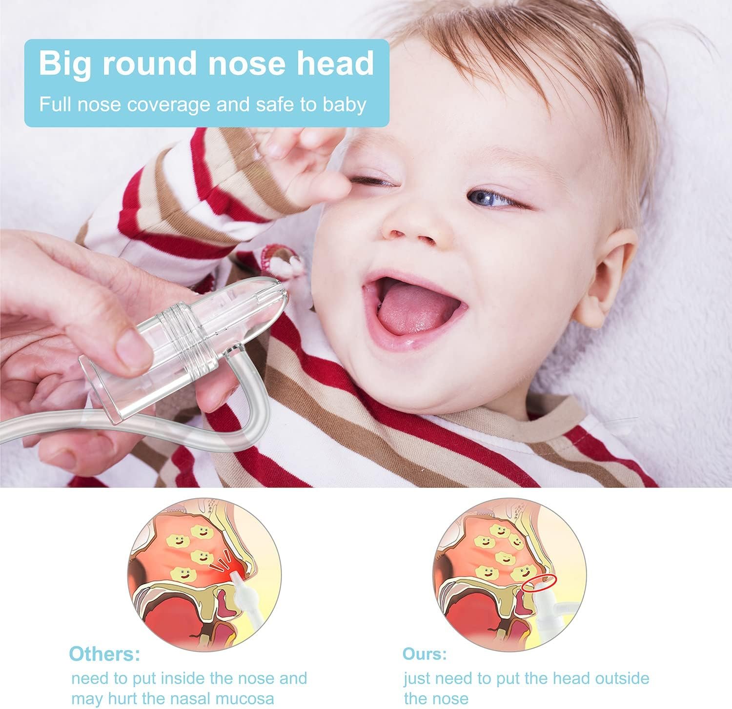 The strong suction on our hand pump helps remove boogers, snot, and mucus with a single pull, so you can clear up stuffy noses in seconds.Unlike hard silicone bulb aspirators that go in the nose we have a round aspirator that sits against the outside of the nostrils for more comfortable use.