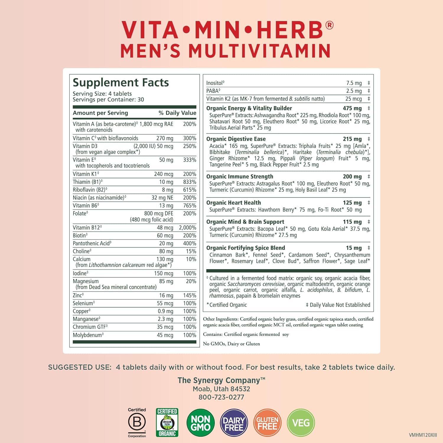 MEN’S DAILY MULTIVITAMIN: Each bottle (120 tablets) provides a comprehensive daily supply of essential vitamins and minerals from whole foods and 20+ organic herbal extracts with targeted support for men’s wellness.