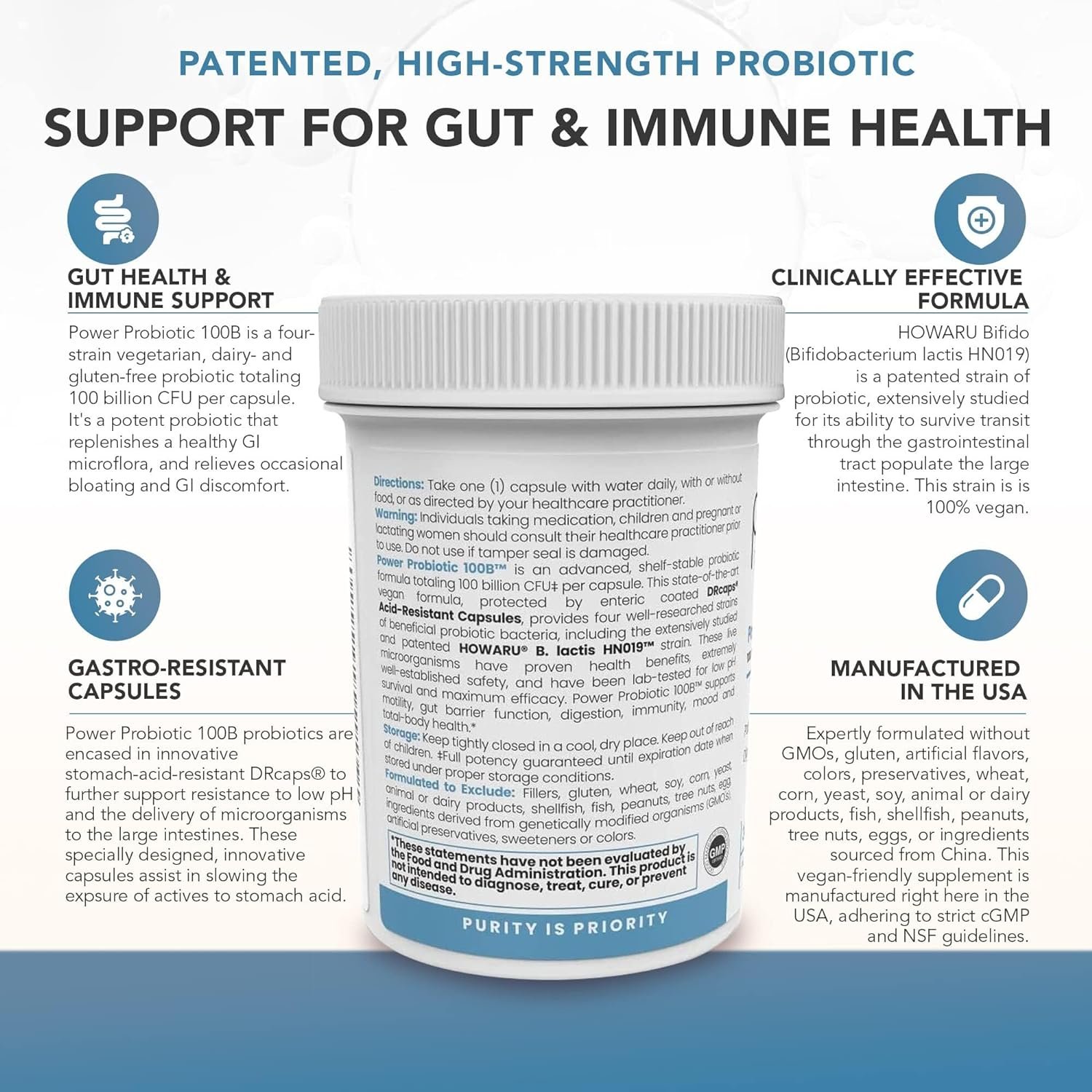 INNOVATIVE GASTRO-RESISTANT CAPSULES: Power Probiotic 100B is delivered in patented DRcaps to promote passage through a low pH environment and successful delivery of the probiotics into the large intestine & colon. With Power Probiotic 100B, you get the powerful probiotic support you need and proven results.