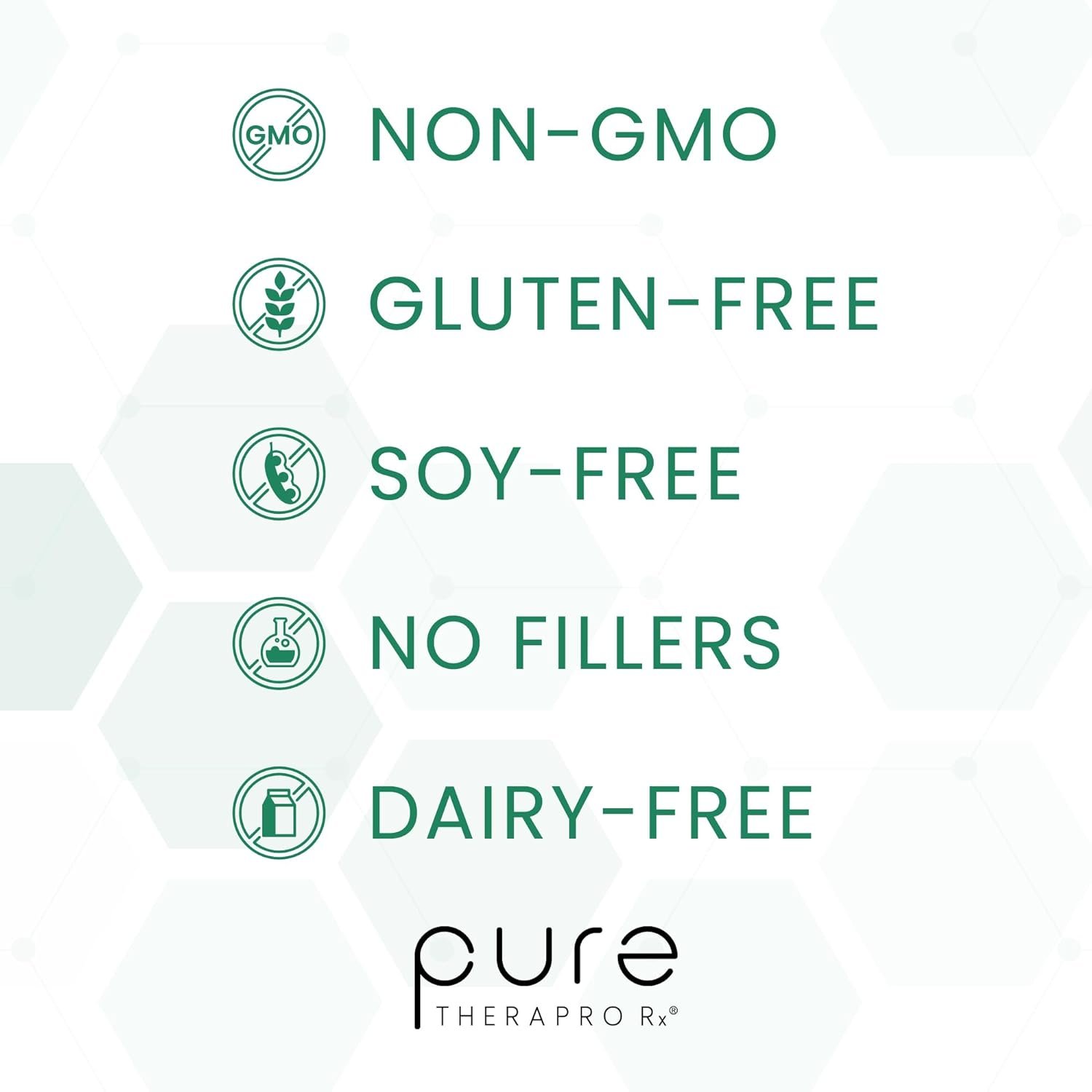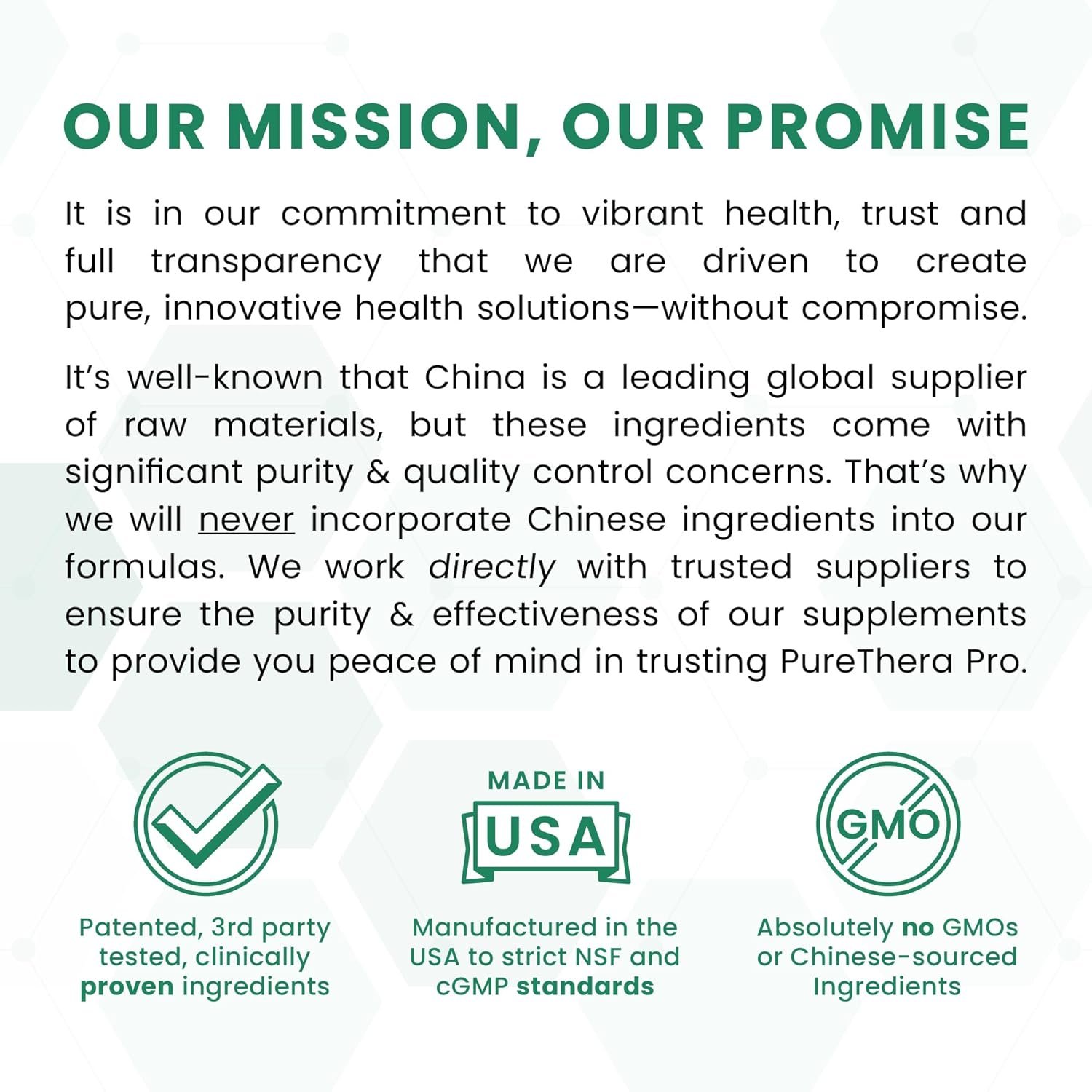 ABOUT US: Pure TheraPro was founded in Denver Colorado to formulate and manufacture the highest quality supplements available on the market today. Purity is our priority, which is why we insist on using patented, clinically studied ingredients, and never utilizing fillers, flow agents, excipients, or ingredients sourced from China. We also never use dairy, gluten, corn, soy, or other common allergens in any of our class-leading, practitioner-recommended formulas.