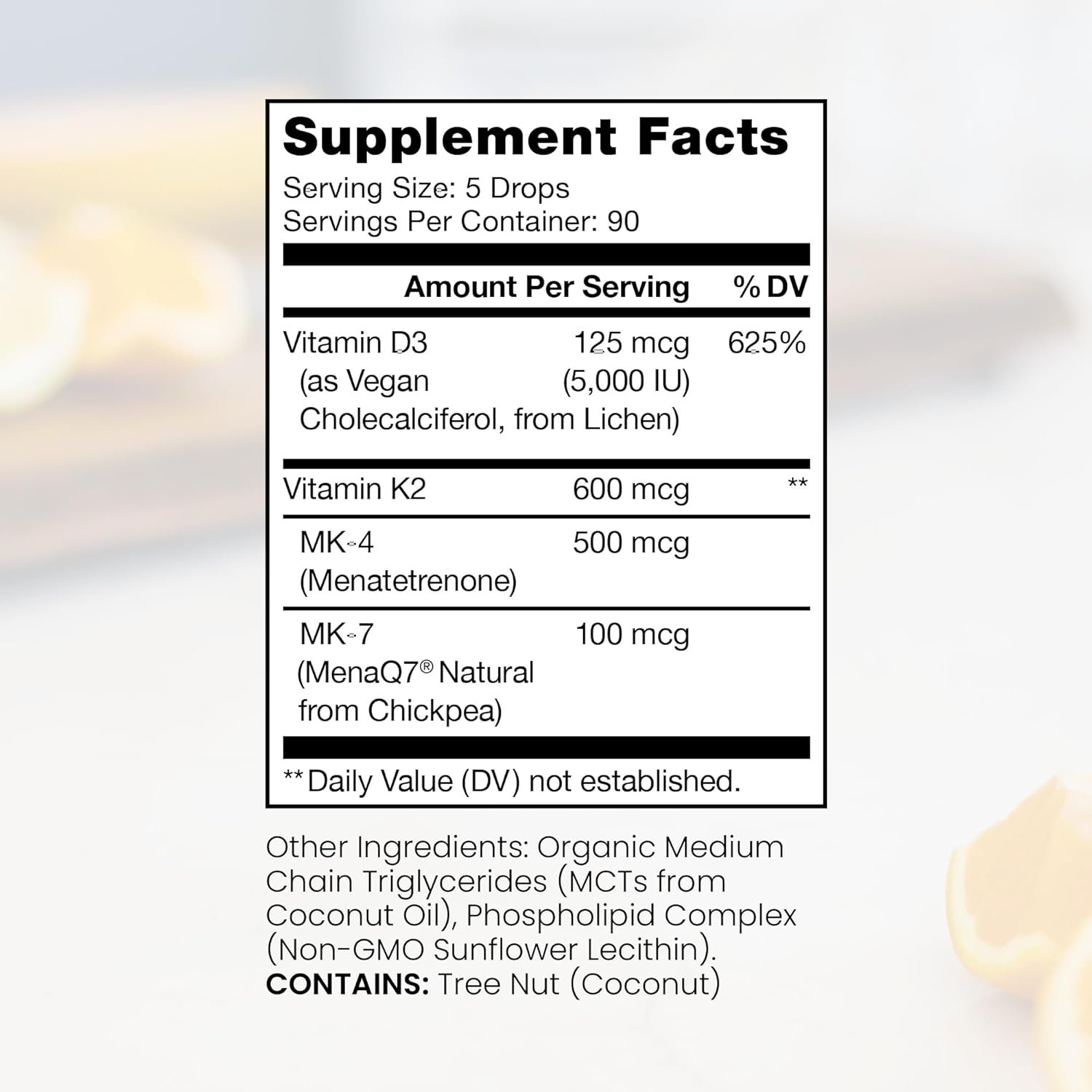 EXCELLENT VALUE: Our vitamin supplement contains essential forms of liposomal Vitamin K2, including patented MenaQ7, a pure and bioactive ‘trans’ form of MK7, and the highest quality vegan liposomal MK4. One serving size of five (5) drops will provide you 5,000 IU liposomal Vitamin D3 + 600 mcg of Vitamin K2 (MK4 and MK7 as MenaQ7).