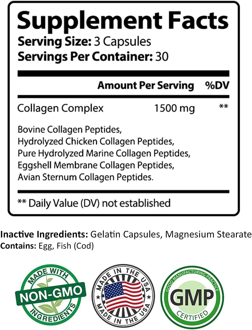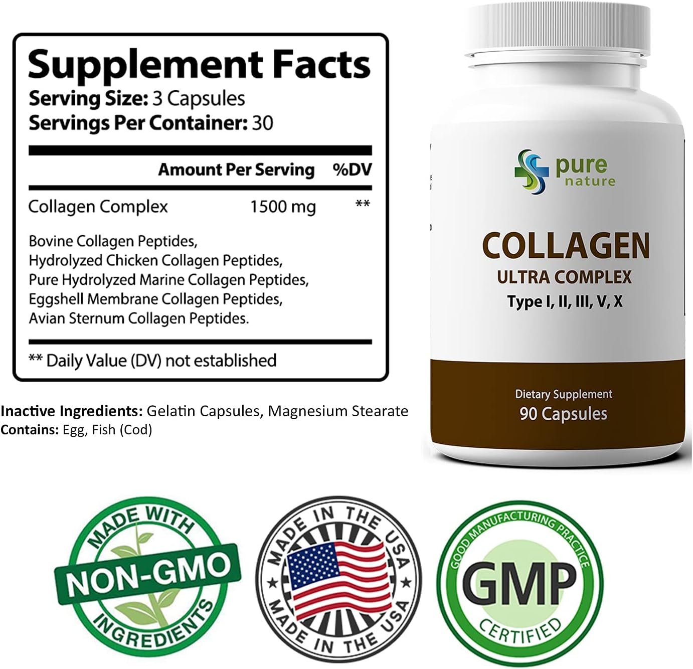 Features Collagen type I, II, III, V and X From non-GMO, grass fed From 4 food sources (beef, chicken, fish and eggshell membrane)