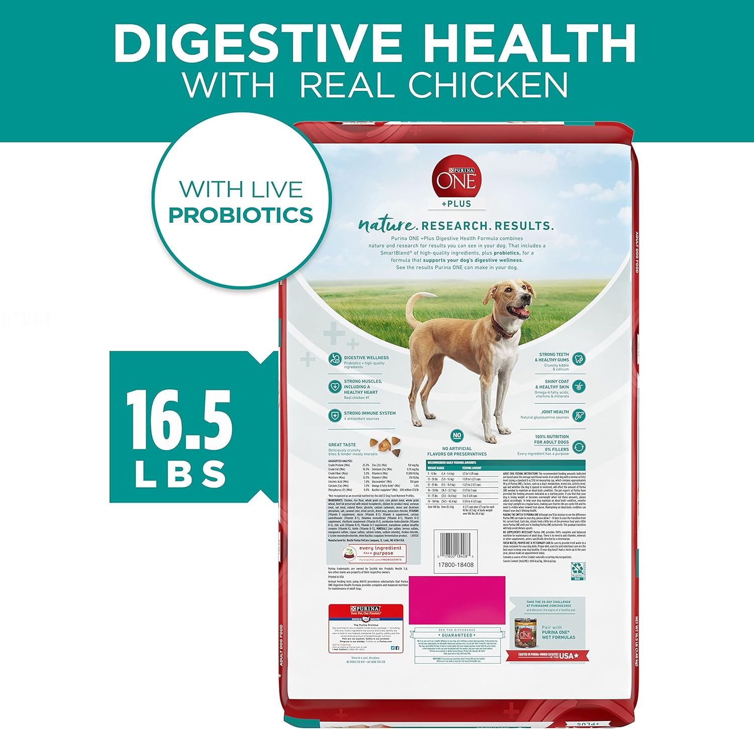 Purina One Plus Digestive Health Formula Dry Dog Food Natural with Added Vitamins, Minerals and Nutrients – 16.5 lb. Bag