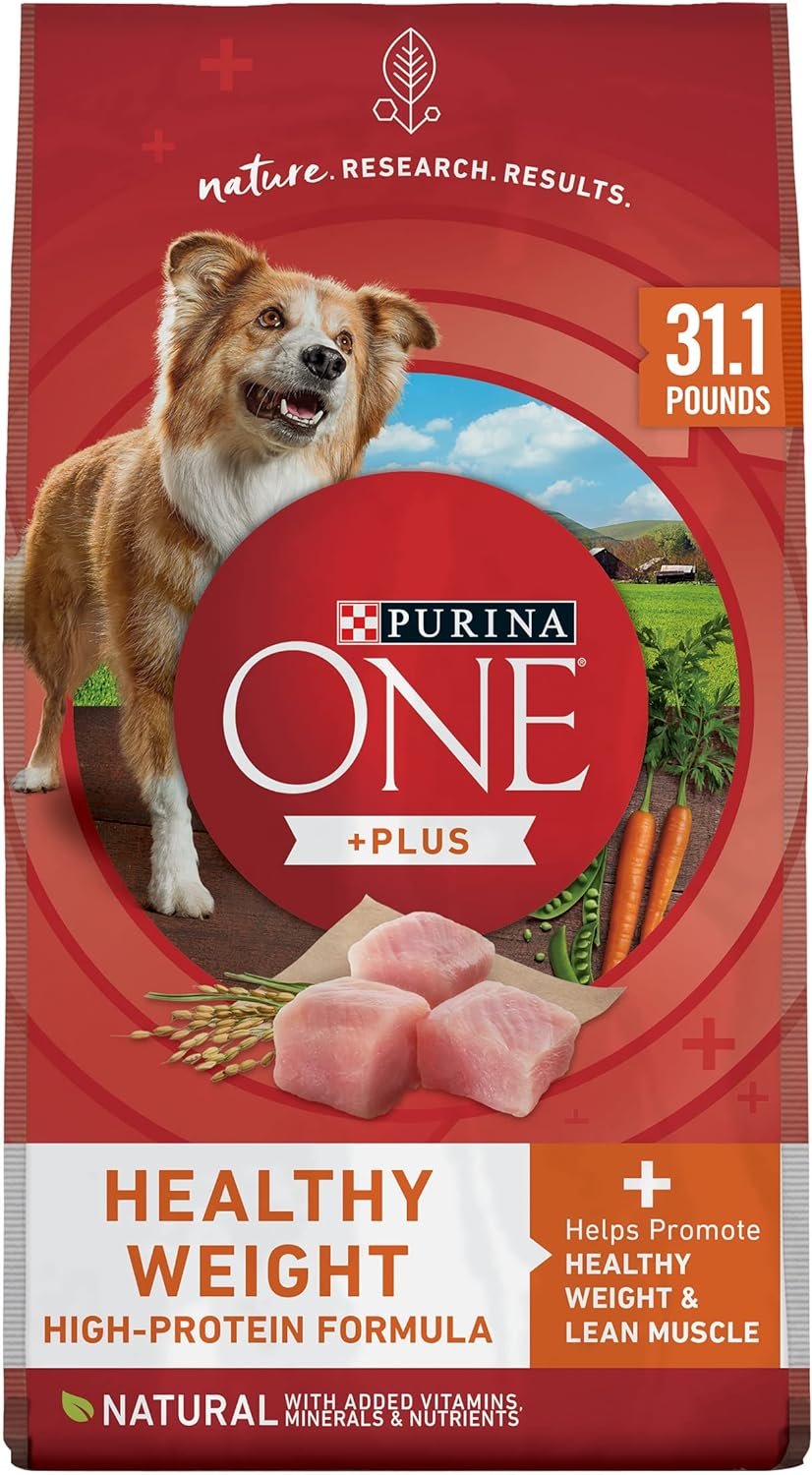 Purina ONE Plus Healthy Weight High-Protein Formula dog food features omega-6 fatty acids, vitamins and minerals to support a shiny, healthy skin and coat for dogs