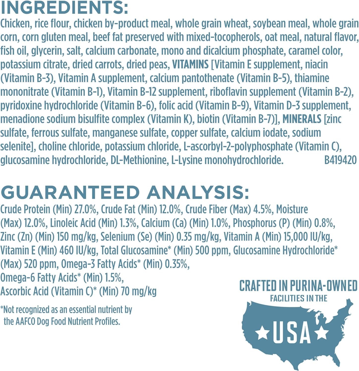 Deliver the targeted nutrition your dog needs for joint and mobility support with Purina ONE +Plus Joint Health Formula Natural With Added Vitamins, Minerals and Nutrients adult dry dog food. We carefully select a SmartBlend of high-quality ingredients, minus any artificial flavors, preservatives or fillers, to deliver 100 percent nutrition for your dog. Real chicken is the first ingredient, and the high protein dog food formula helps support his strong muscles, including a healthy heart. We add fish oil and glucosamine for mobility and joint health for dogs, which is especially important for medium-to-large breed or senior dogs, and we craft our Purina ONE +Plus kibble dog food in Purina-owned facilities, so you can be confident knowing where his food is made. This Purina ONE dry dog food for hip and joint care contains four antioxidant sources to help maintain a strong immune system, and omega-6 fatty acids, along with vitamins and minerals, help support his shiny coat and healthy skin.,Purina ONE is produced in U.S. facilities where we take steps to make it good for your dog and good for the environment, like reducing water and using renewable electricity. When your dog has finished enjoying this food, please check your label for recycling guidance.