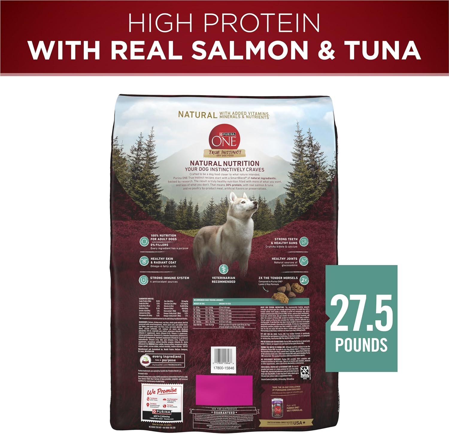 Satisfy your dog’s cravings with Purina ONE True Instinct With Real Salmon and Tuna natural dry dog food with added vitamins, minerals and nutrients. Real salmon is the number 1 ingredient, and we include real tuna in every serving. With 100 percent nutrition and 0 percent fillers, every ingredient has a purpose. Every serving also contains 30 percent protein to support his strong muscles along with natural sources of glucosamine to support his healthy joints. Together, they help craft a complete and balanced dog food. Omega-6 fatty acids in the high protein dry dog food also support his healthy skin and a radiant coat, and the crunchy dog food kibble and calcium support his strong teeth and healthy gums. We craft the wholesome dog food with no poultry by-product meal and no artificial flavors or preservatives. Offer up a serving of this Purina ONE True Instinct Natural dry dog food with salmon formula, and show your dog just how much you care.,Purina ONE is produced in U.S. facilities where we take steps to make it good for your dog and good for the environment, like reducing water and using renewable electricity. When your dog has finished enjoying this food, please check your label for recycling guidance.