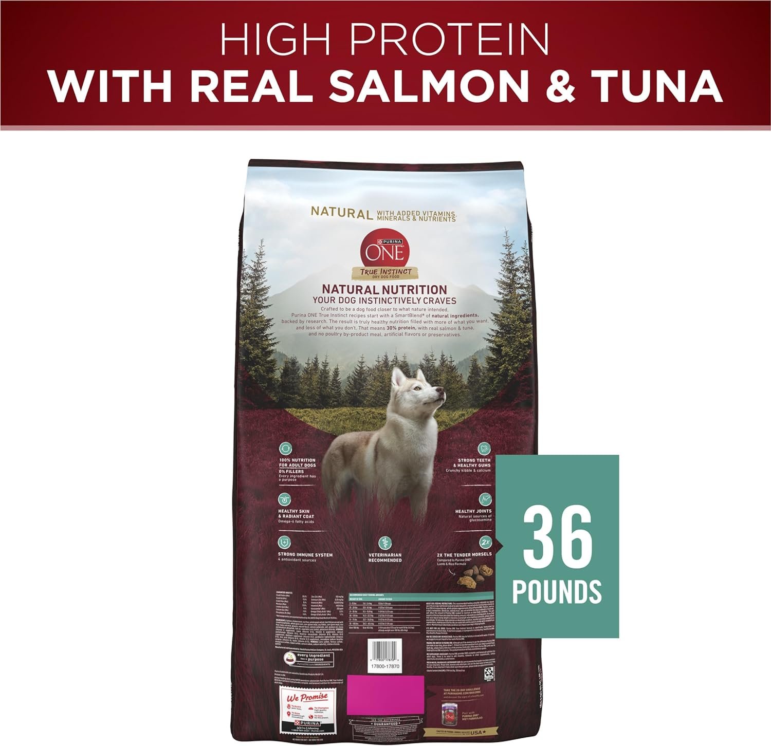 Watch your dog come running when you feed him Purina ONE True Instinct With Real Salmon and Tuna natural adult dry dog food with added vitamins, minerals and nutrients. Real salmon is the number 1 ingredient, and we include real tuna in every Purina dog food serving. With 100 percent nutrition and 0 percent fillers, every ingredient has a purpose. Every serving also contains 30 percent protein to support his strong muscles along with glucosamine to support his healthy joints. Together, they help craft a complete and balanced dog food full of the goodness your adult dog needs. Omega-6 fatty acids in the high protein dry dog food also support his healthy skin and a radiant coat, and the crunchy kibble and calcium support his strong teeth and healthy gums. We craft this wholesome Purina ONE dog food with no poultry by-product meal and no artificial flavors or preservatives. Give your dog this Purina ONE True Instinct Natural dry dog food with salmon formula, and show him how much you love him.,Purina ONE is produced in U.S. facilities where we take steps to make it good for your dog and good for the environment, like reducing water and using renewable electricity. When your dog has finished enjoying this food, please check your label for recycling guidance.