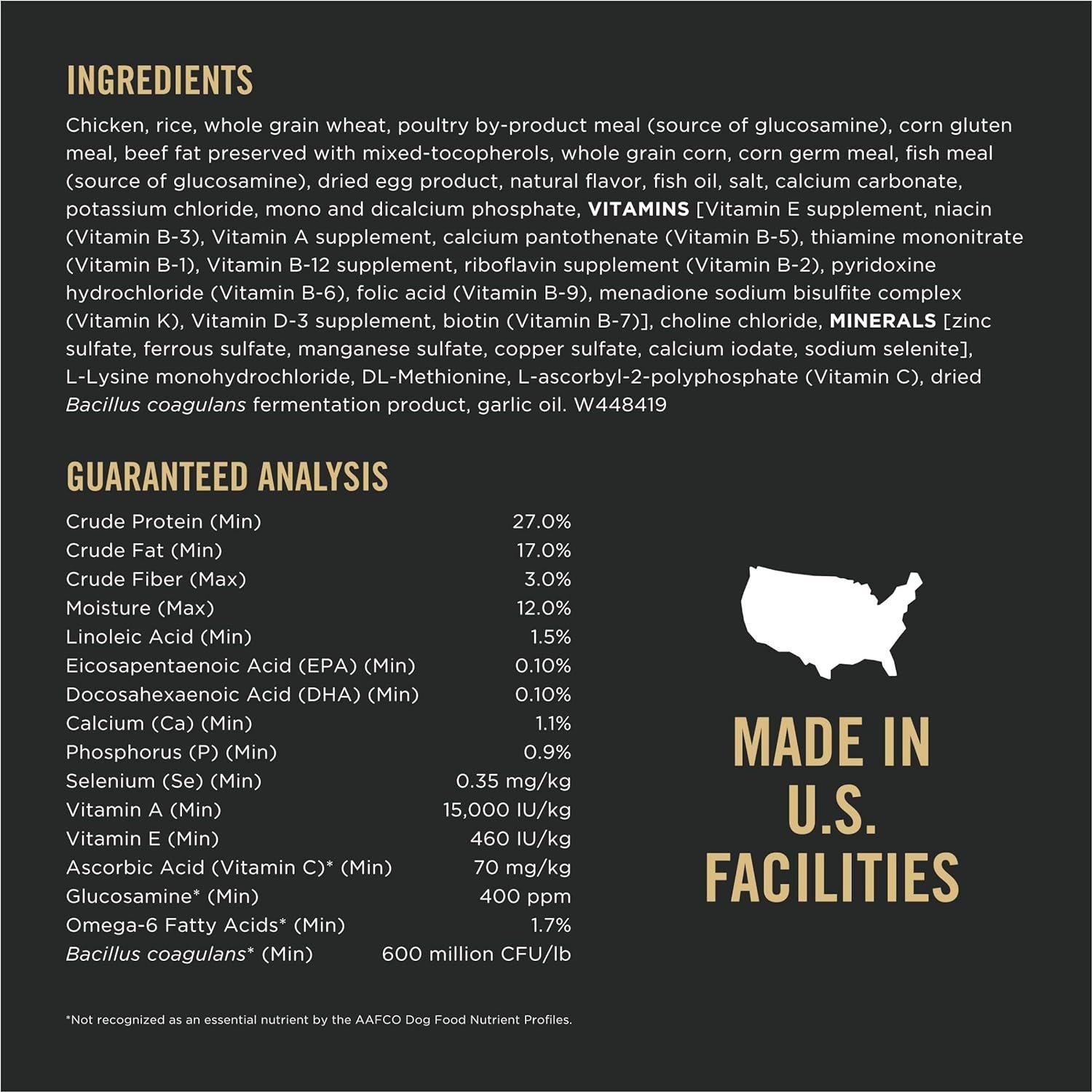Give your dog the nutrition he needs to excel with Purina Pro Plan Brand Dog Food Active 27/17 Chicken and Rice Formula dry dog food. Including chicken as the first ingredient, this high protein dog food helps to promote total body health. The highly digestible dog food formula helps promote optimal nutrient delivery to support active dogs, whether they enjoy running by your side or taking long walks. With 27 percent protein and 17 percent fat to help maintain lean muscle and an ideal body condition, and rich in antioxidants to help support your dog’s healthy immune system, this Purina Pro Plan dog food helps you care for his overall health every time you fill his dish. Each serving of Purina Pro Plan Active 27/17 offers 100 percent complete and balanced nutrition throughout every stage of his life, so he can enjoy the food he loves from his playful puppy days all the way up to his senior years.