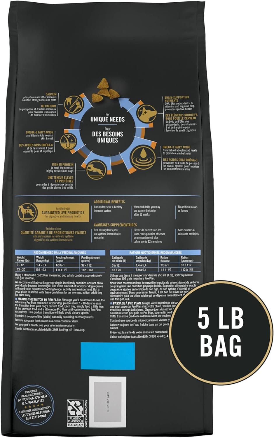 Feed your small breed dog a complete and balanced dog food that supports calm behavior with Purina Pro Plan Calm & Balanced Adult Chicken & Rice Calming Dog Formula. This premium dog food formulated for dogs under 20 pounds at maturity is packed with ingredients to support your dog’s mental well-being. Included is a powerful blend of brain-supporting nutrients like DHA, EPA, antioxidants, B Vitamins and arginine for cognitive health and Omega-3 fatty acids at optimized levels for promoting calm behavior when fed daily for 12 weeks. This dog food includes dog probiotics and is highly digestible for optimal nutrient delivery to give your dog digestive support. This high protein dog food features chicken as its #1 ingredient to help meet the needs of highly active small dogs and Omega-6 fatty acids and Vitamin A to keep their skin and coat healthy and shiny. Each bite of this small breed dry dog food delivers glucosamine for dogs to support healthy joints and mobility.