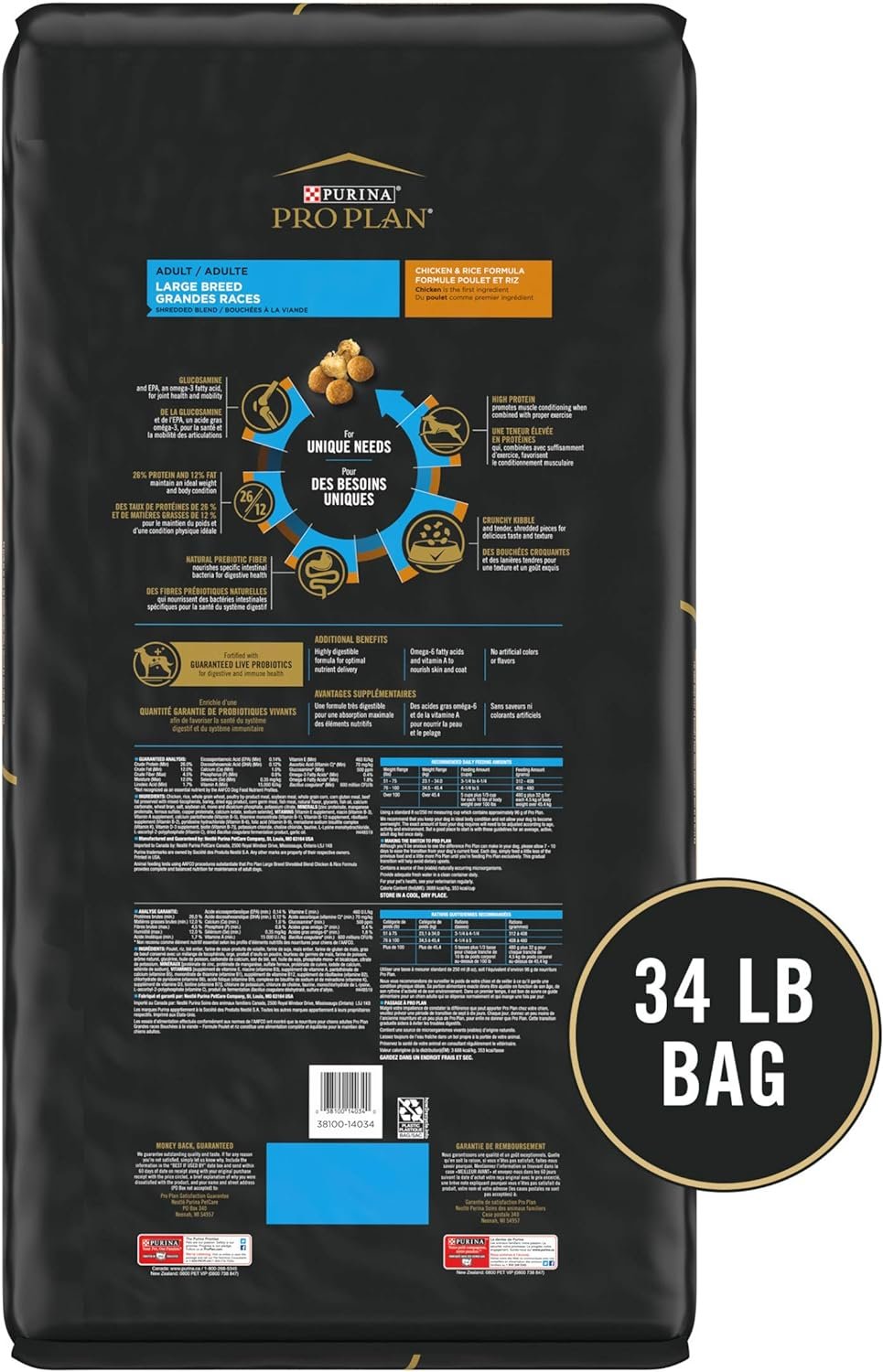 Give your big dog the taste he loves with Purina Pro Plan Brand Dog Food Large Breed Shredded Blend Chicken and Rice Formula adult dry dog food. Real chicken as the first ingredient helps deliver the meaty taste he craves while giving him outstanding nutrition you can feel good about serving every day. Each serving provides optimal protein and fat levels to help maintain your dog’s lean muscles and body condition. Watch as he savors every bite of this large dog food formula that contains 100 percent complete and balanced nutrition. Take comfort knowing he’s getting the nourishment he needs at mealtime with this high protein dog food formula that is fortified with guaranteed live probiotics to support his digestive and immune health, as well as natural prebiotic fiber, sourced from wheat bran. With its combination of tender shredded pieces and hard kibble, this immune system support dry dog food delivers a pleasing texture dogs love in a formula created specifically for large breeds.