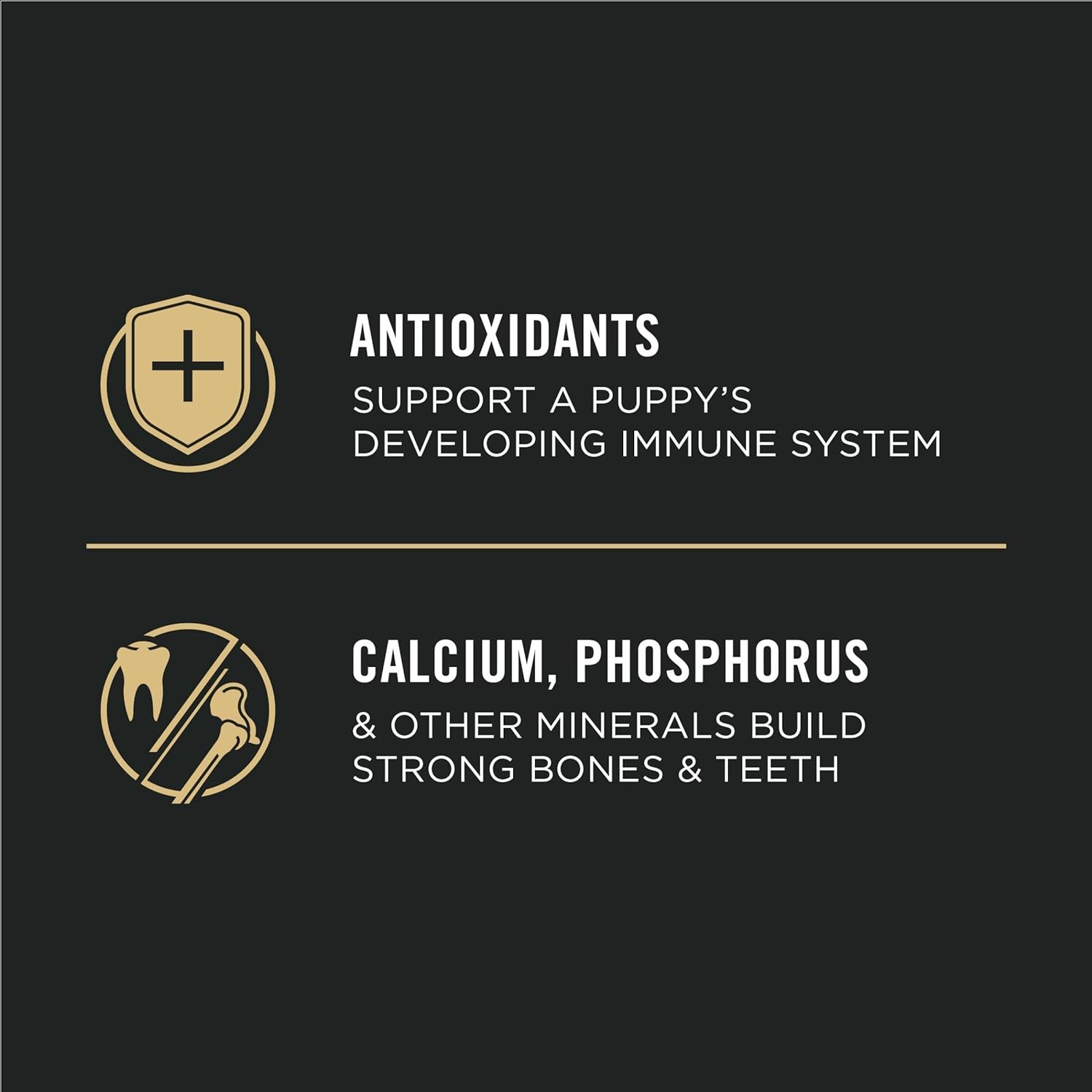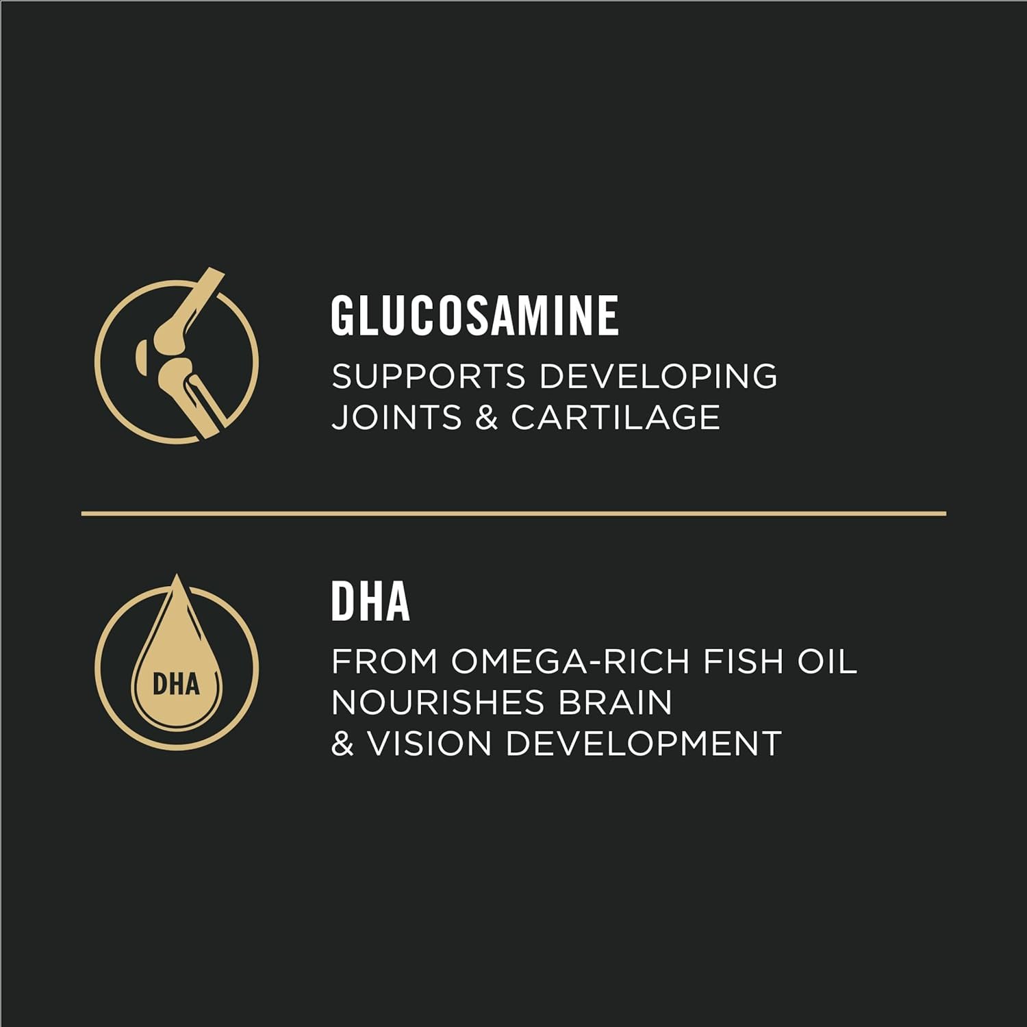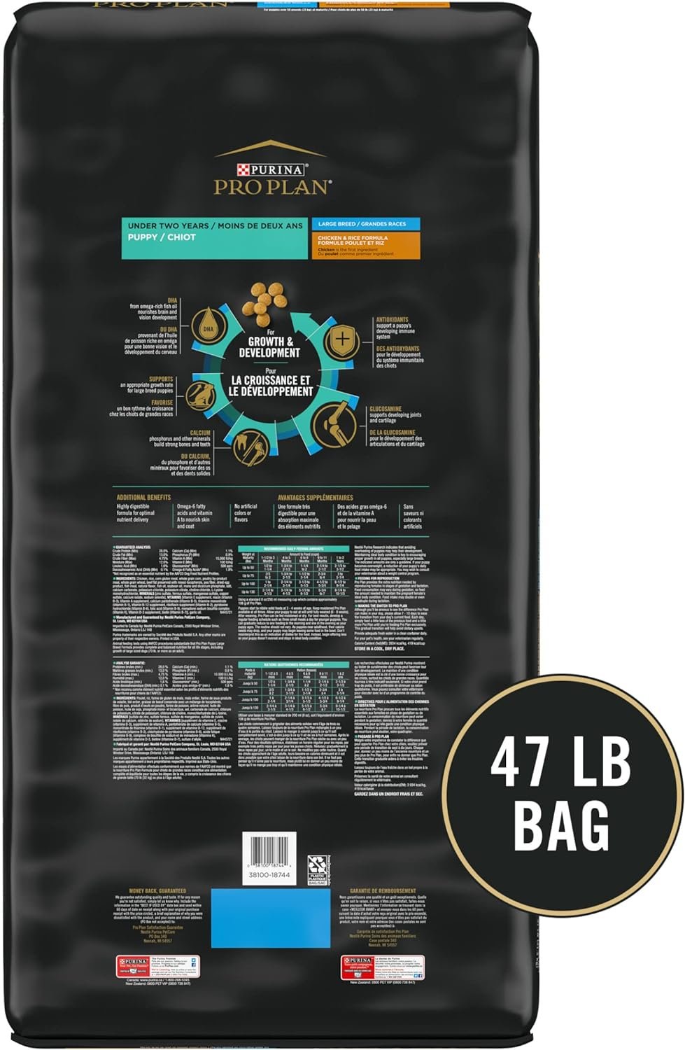 Provide your large breed puppy with a great start in life by serving him the wholesome nutrition in Purina Pro Plan Brand Dog Food Puppy Large Breed Chicken and Rice Formula dry puppy food. High-quality protein, including chicken as the number1 ingredient, delivers the building blocks he needs to maintain his active lifestyle, and the nutrient-rich formula is designed for puppies weighing over 50 pounds at maturity. Every high-quality ingredient in this super-premium dry puppy food is carefully chosen for a specific nutritional or functional purpose. DHA from fish oil nourishes his brain and vision development, while vitamin A and omega-6 fatty acids support his healthy skin and coat. Crunchy kibble and a delicious flavor tempt your curious canine to his bowl at mealtime, while antioxidants support his developing immune system. Make this large breed dry puppy food part of your puppy’s complete and balanced diet, and show him you care about his overall health and happiness.