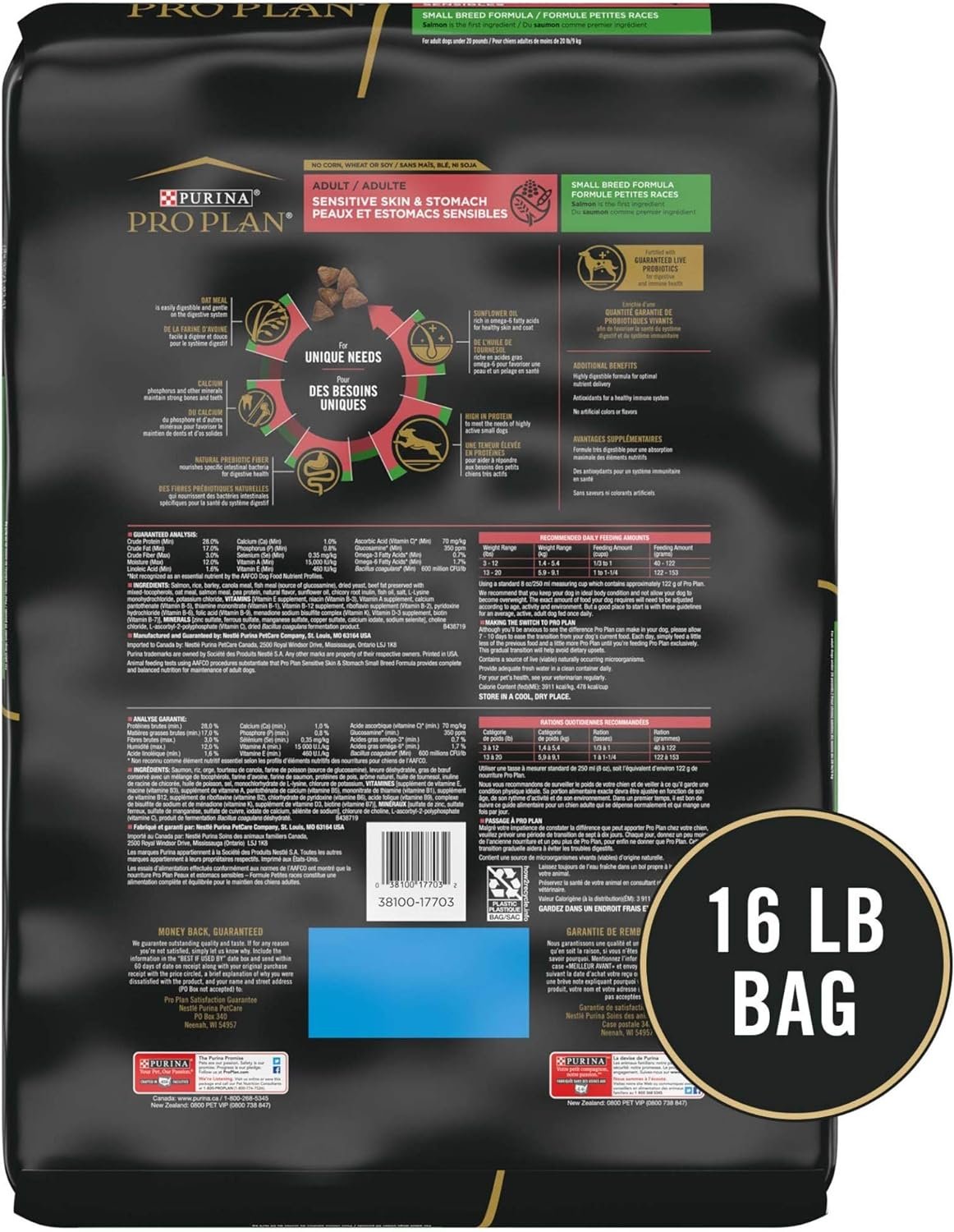 Help your small dog put his best foot forward with Purina Pro Plan Brand Sensitive Skin and Stomach Small Breed Formula adult dry dog food. This highly digestible dog food formula features salmon as the first ingredient, and every high-quality ingredient is carefully selected for a specific nutritional or functional purpose. Easily digestible oat meal in every serving of this sensitive skin and stomach dog food helps protect his digestive system, while natural prebiotic fiber nourishes specific intestinal bacteria for digestive health. Made without corn, wheat or soy, and without poultry by-product meal, this small dog food formula gives him wholesome goodness with every bite. Your dog gets the specialized nutrition he needs combined with 23 essential vitamins and minerals to help support his overall health and wellness. Give your canine companion a small breed dog food for sensitive stomachs formulated specifically for little dogs under 20 pounds, and enjoy his loving adoration.