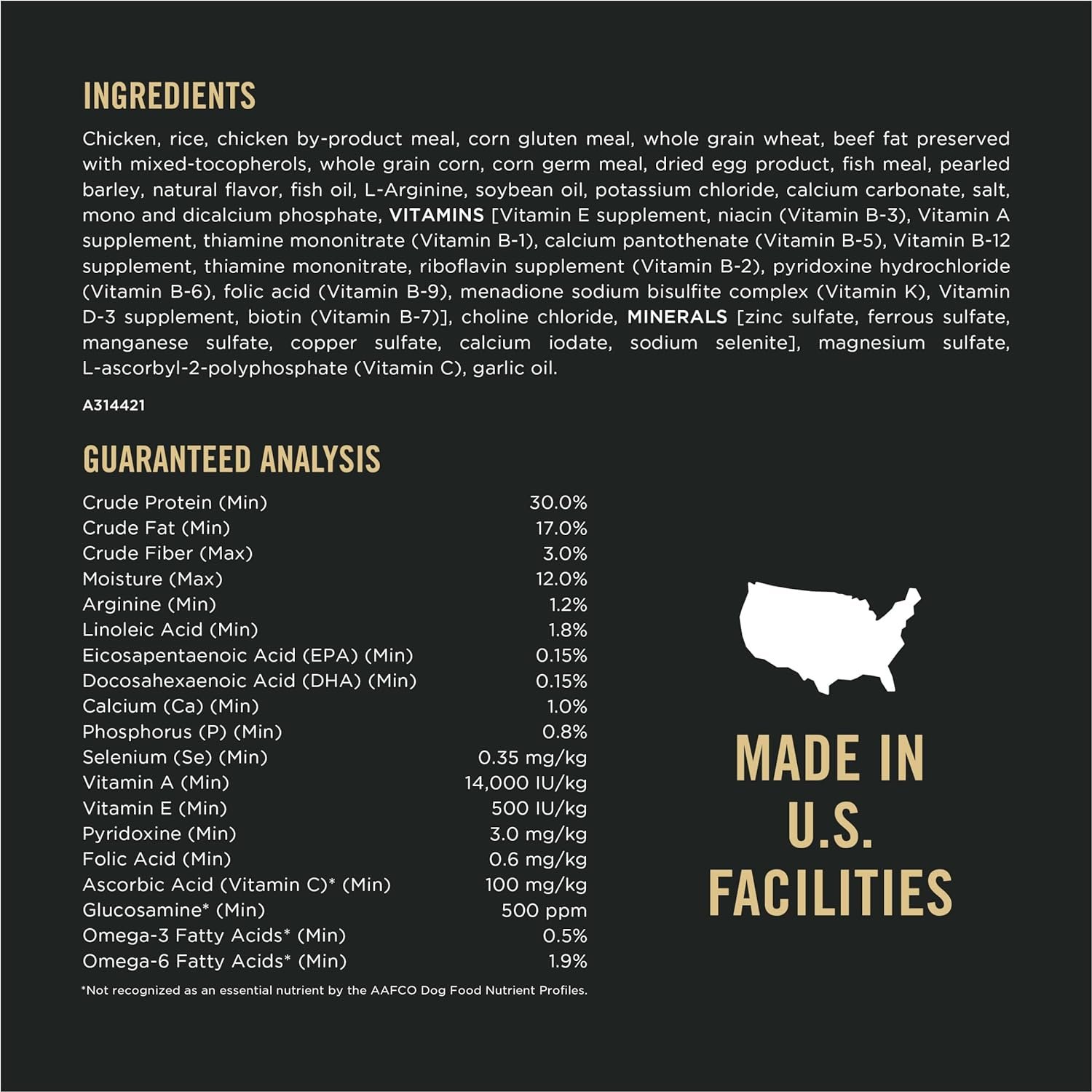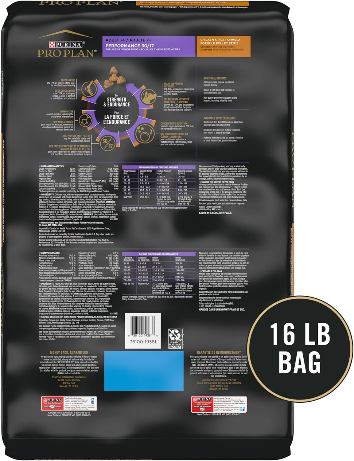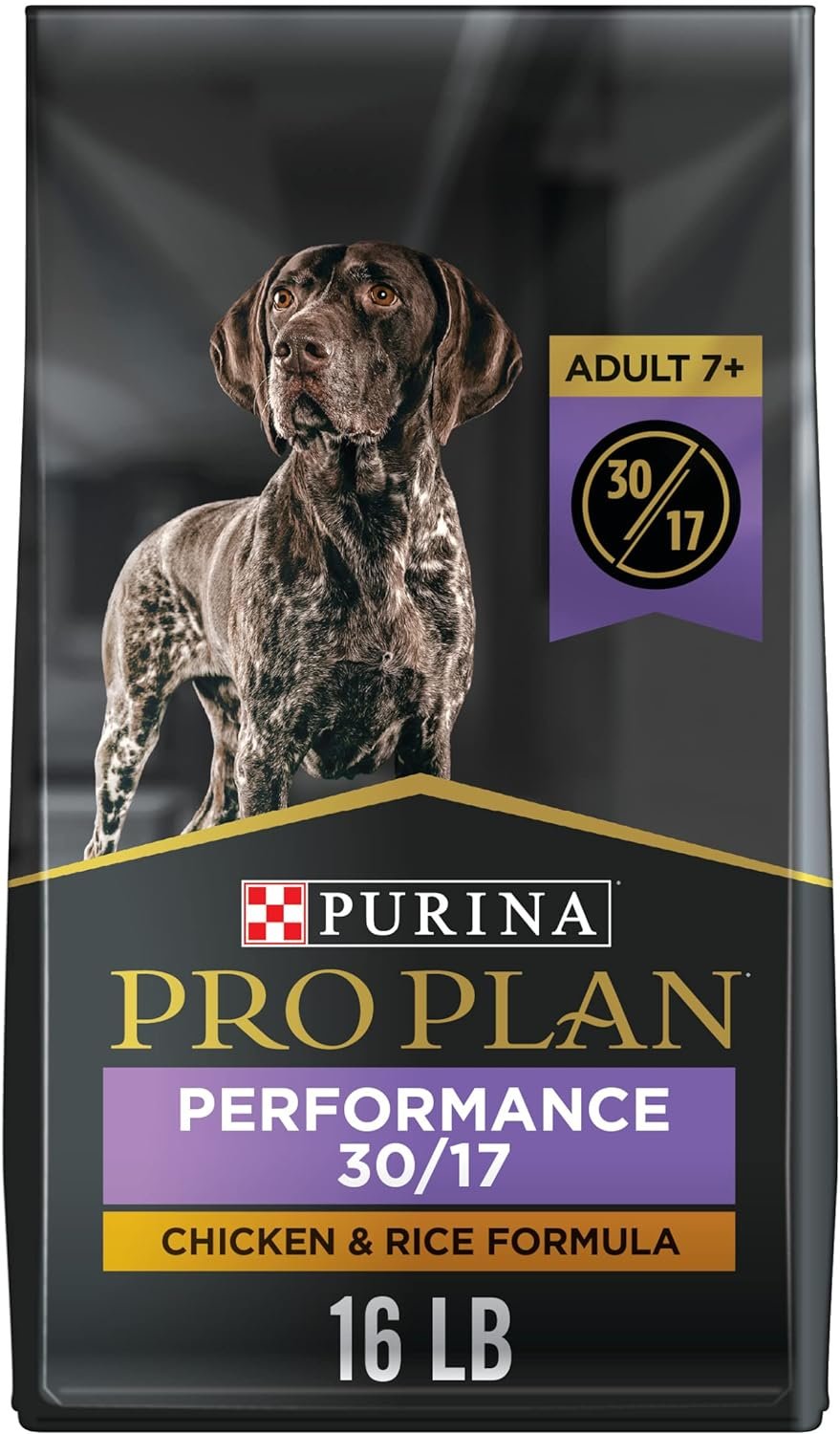 Keep your senior dog active and engaged with Purina Pro Plan Sport Adult 7+ Performance 30/17 Chicken & Rice Formula Senior Dry Dog Food. Real chicken is the number 1 ingredient in this senior dog food formulated with 30 percent protein and 17 percent fat to help fuel your active dog’s metabolic needs and maintain their lean muscle. The concentrated nutrition within this highly digestive dog food boosts oxygen metabolism (VO2 max) for increased endurance. High-quality protein to supports heart health and amino acids nourish muscles, including the crucial time following exercise. It includes glucosamine and EPA, an Omega-3 fatty acid, making it an excellent dog food for joint health. This Purina Pro Plan Sport dog food for senior dogs has brain-supporting nutrients like DHA, EPA, B vitamins, arginine and antioxidants for dogs supporting cognitive health. Each Purina Pro Plan adult dog food is tested for quality and safety and is proudly manufactured at Purina-owned U.S. facilities.