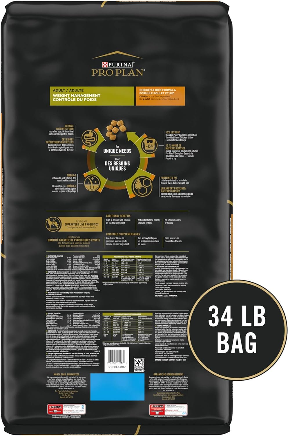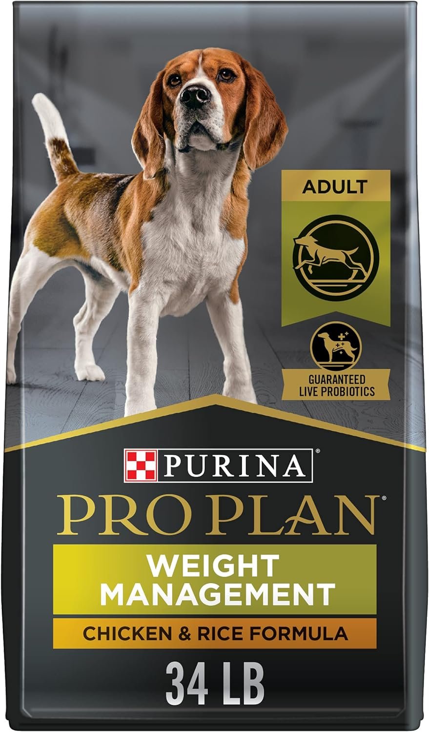 Support your dog’s special nutritional needs with Purina Pro Plan Dog Food Weight Management Chicken and Rice Formula adult dry dog food. Each serving contains 15 percent less fat than Pro Plan ESSENTIALS Shredded Blend Chicken and Rice Formula for Adult Dogs, giving you a convenient way to help maintain your dog’s healthy weight. Chicken as the first ingredient helps provide protein, one of the essential nutritional building blocks, and an optimal protein-to-fat ratio helps him maintain muscle mass during weight loss. Every high-quality ingredient in this healthy weight Purina dog food is carefully chosen for a specific nutritional or functional purpose, so you can feel good about the food you offer your canine companion. Formulated to provide 100 percent complete and balanced nutrition for overweight or less active adult dogs, this formula helps to support your dog’s overall health and wellness so he can keep up with your active daily life.