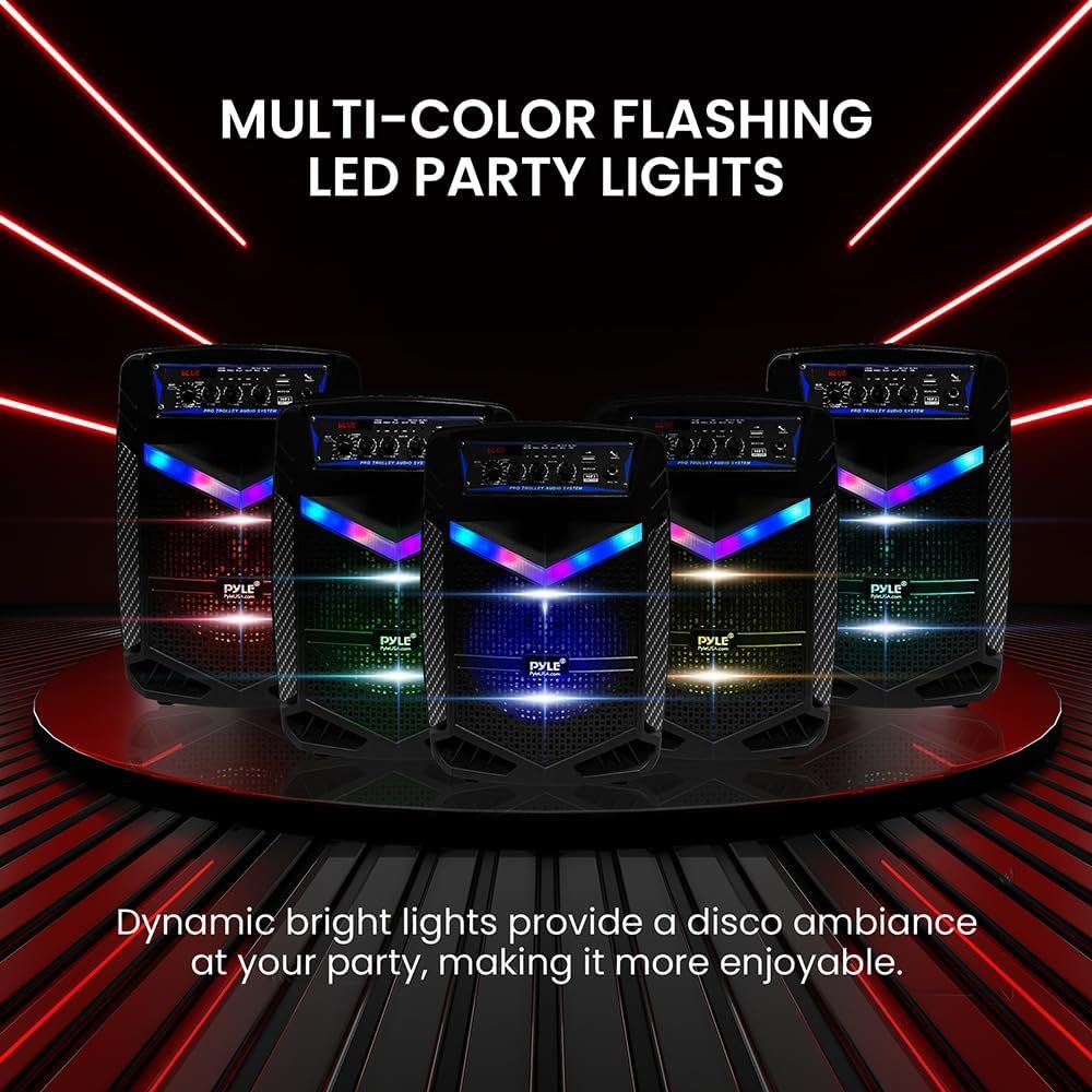 Features: – True Wireless Stereo System – Portable Speaker System – High-Powered PA Loudspeaker Style – Bluetooth Wireless Music Streaming Ability – Multi-Color Flashing LED Party Lights – Built-in Rechargeable Battery – FM Radio with Digital LED Display – Connect & Stream Audio from External Devices – Aux (3.5mm) Input Connector Jack – USB Flash Memory Reader – Micro SD Card Reader – 6.5mm Microphone input – Battery Level LED Indicator Lights – Recording Function – Microphone Priority Function – Bass & Treble Adjust Knobs – Rugged & Durable Molded Cabinet Design – Convenient Trolley & Wheels – For Indoor / Outdoor Use Bluetooth Wireless Streaming: – Built-in Bluetooth for Wireless Music Streaming – Simple & Hassle-Free Pairing – Works with All of Today’s Latest Devices – Smartphones, Tablets, Laptops, Computers, etc. – Bluetooth Version: 4.2 – Bluetooth Network Name: ‘PYLEUSA’ – Wireless Range: Up to 32’ ft. What’s in the Box: – PA Speaker System – Remote Control – Power Adapter – Wired microphone Technical Specs: – Construction Material: Polypropylene (PP) – Max Power Output: 400 Watt Max – Sound System: 8’’ -inch Subwoofer + 1” Tweeter – Impedance: 3.6 Ohm – USB Interface Type: 2.0 – Digital Audio File Support: MP3 – Maximum USB Flash Support: 32GB – Remote Control Battery Operated, 1 Piece Button Cell Battery CR-2025 (Included) – Battery Life: Up to 3 Hours (Charge Time: Approx. 5Hours) – Rechargeable Battery: 3.7V, 3600mAh – 13.32Wh – Power Supply: 120/240V, Switchable (5V/2A Power Adapter) – Product Dimensions (L x W x H): 9.3’’ x 7.8’’ x 14.3’’ -inches.
