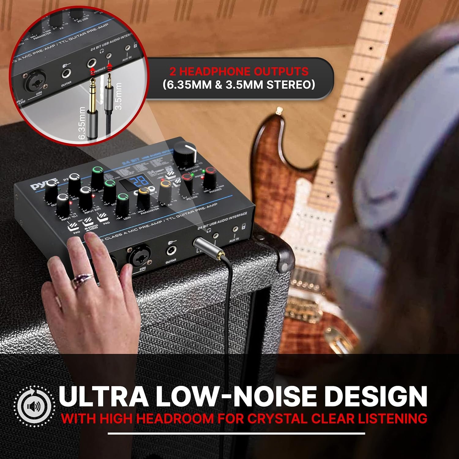ULTRA LOW NOISE DESIGN: This professional USB audio interface has signal output thru the headphones. It also features equalizer knobs, LED lights, fx knob, and multiple output knobs for adjusting audio from different sources & can switch mono stereo