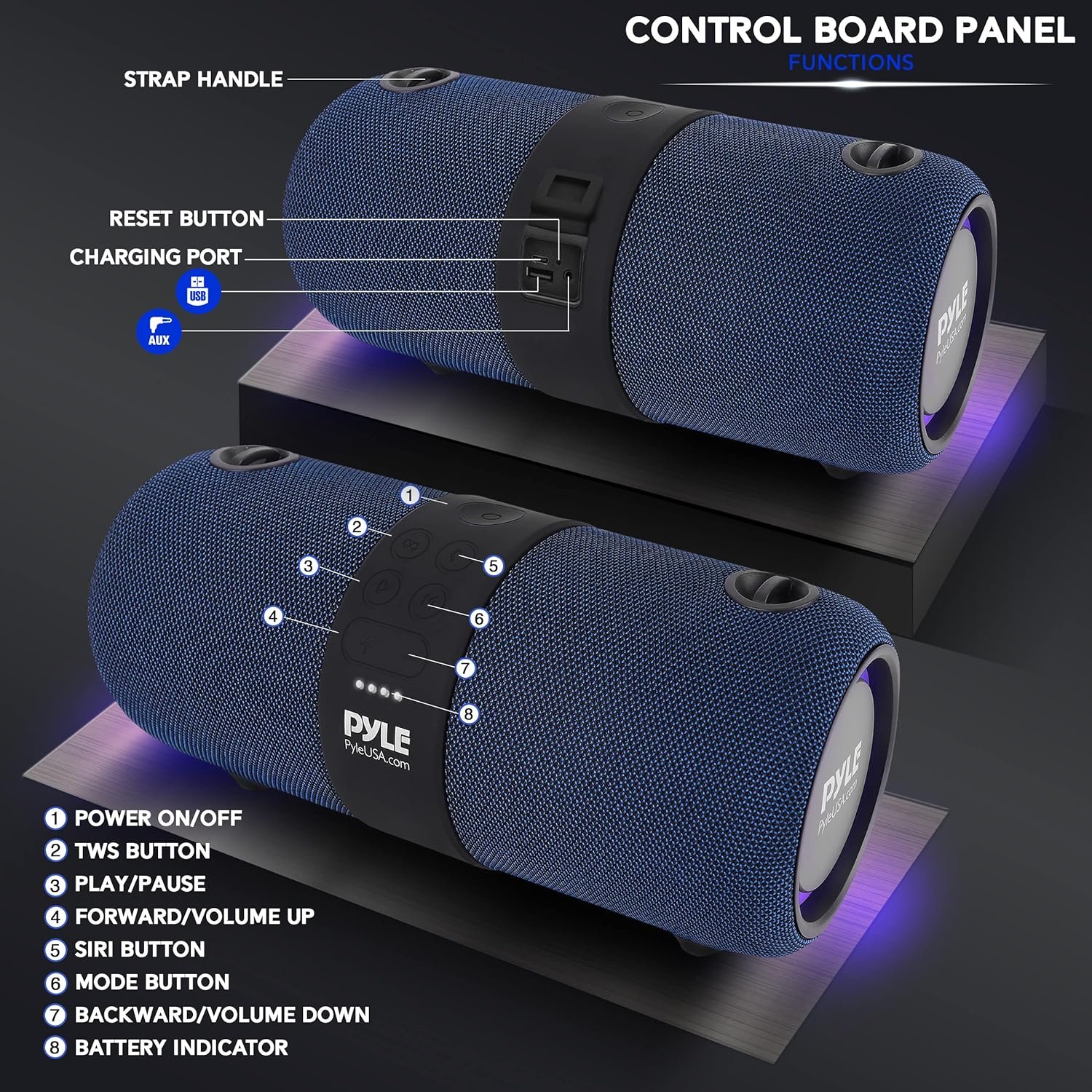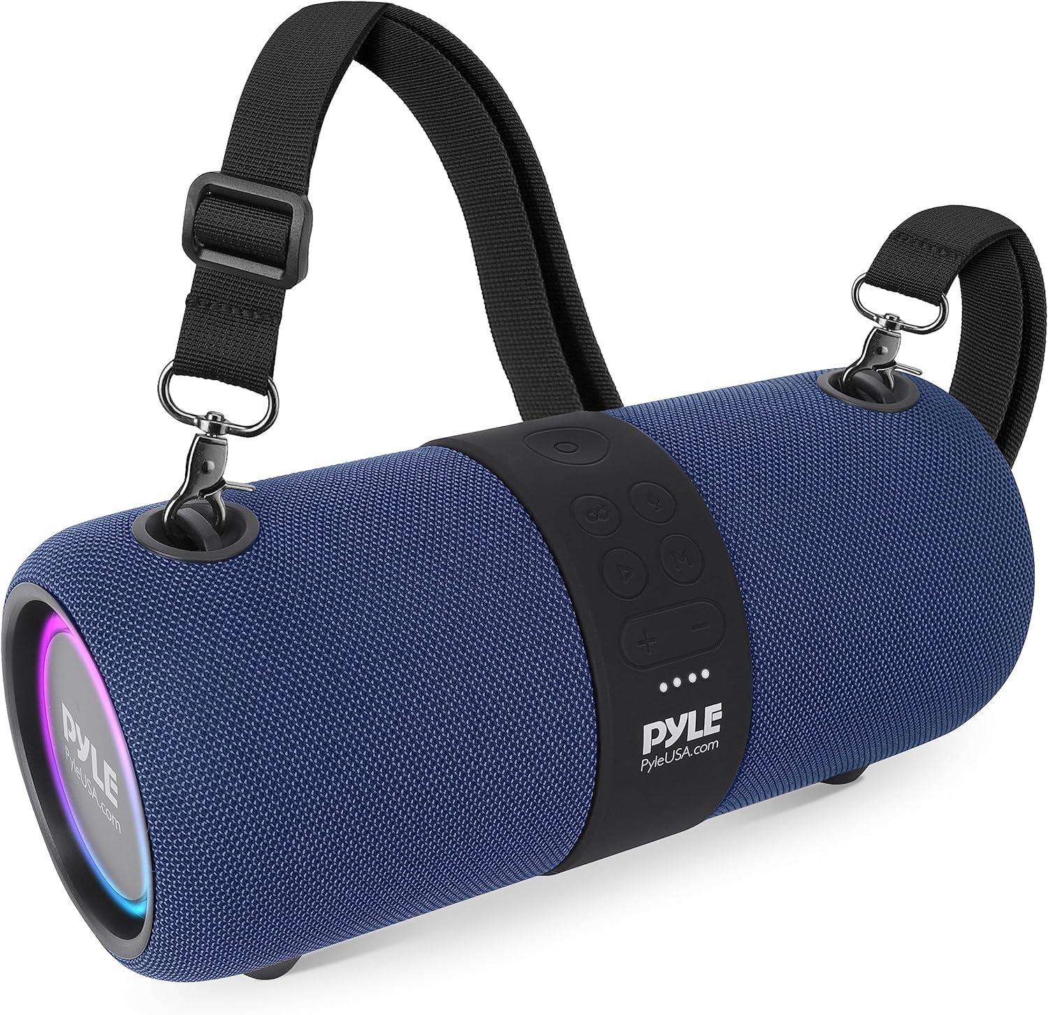 PyleUsa Wireless Portable Bluetooth Boombox Speaker – 2Ch Waterproof Rechargeable Fabric Stereo Speaker w/Google Assistant/Siri Voice Control, TWS Function, USB FM Radio, RGB Lights -PSBWP9BL (Blue)