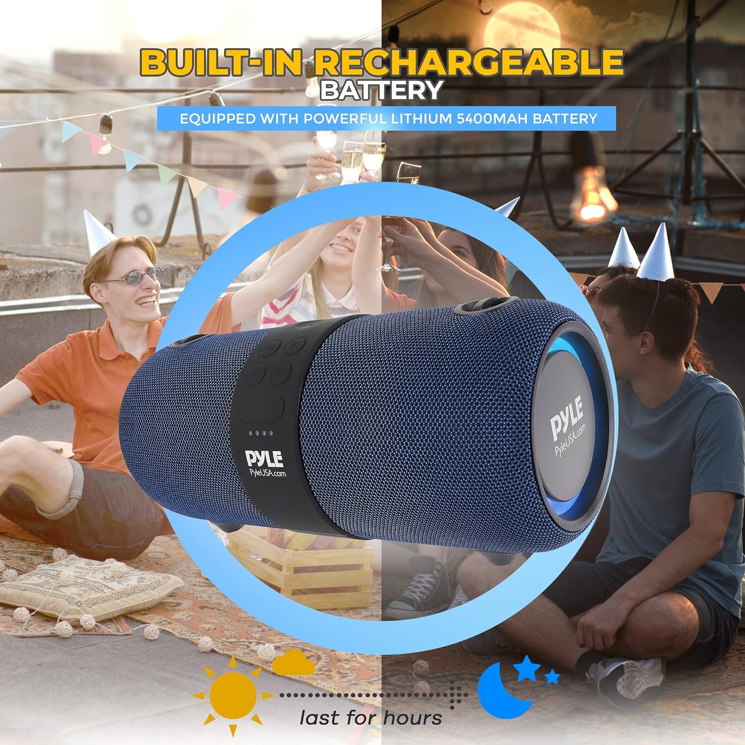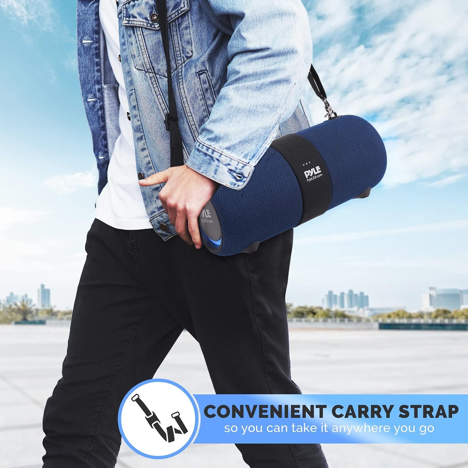 RECHARGEABLE BATTERY: Pyle boombox bluetooth speaker is equipped w/ a built-in 3.7V Li-iOn, 5400mAh rechargeable battery w/ up to 6 hours of play time at maximum volume (with light off). Comes with a shoulder strap for easy travel