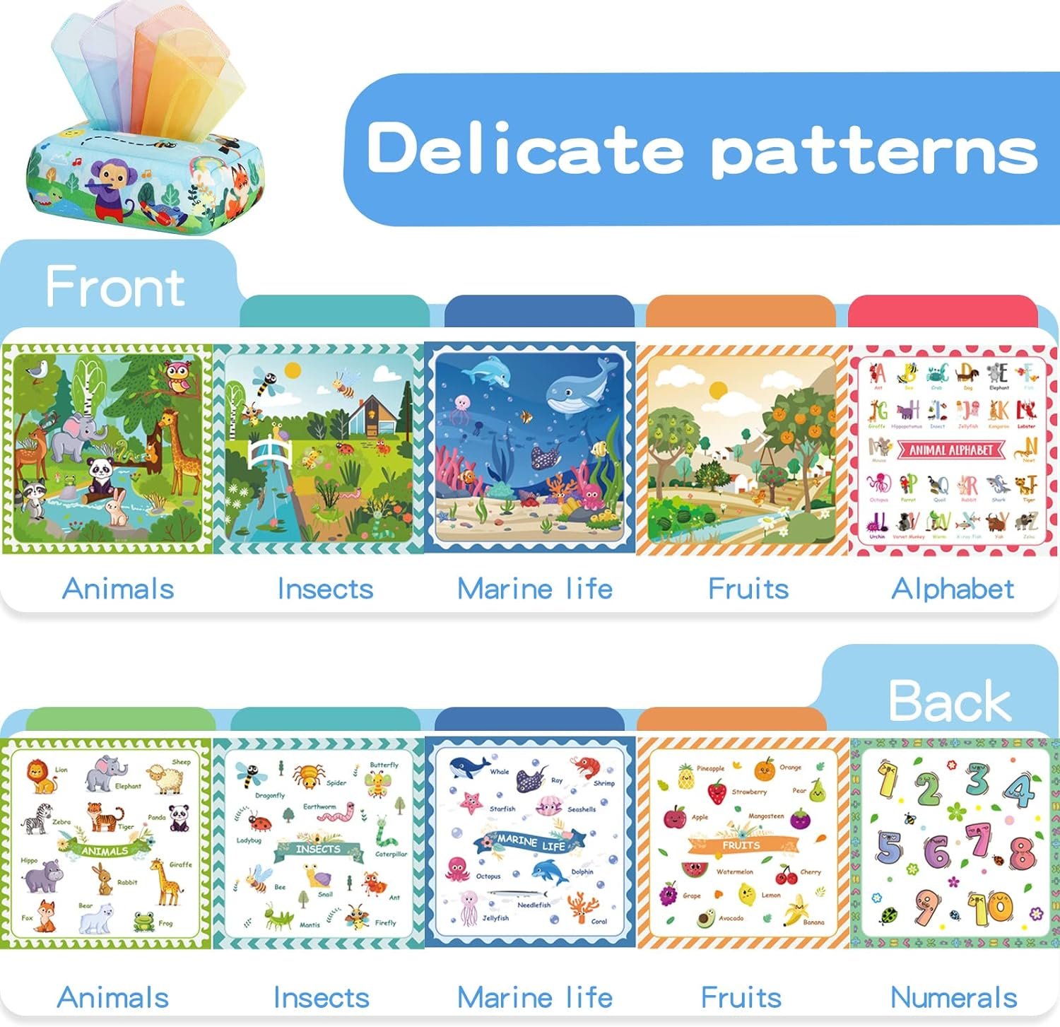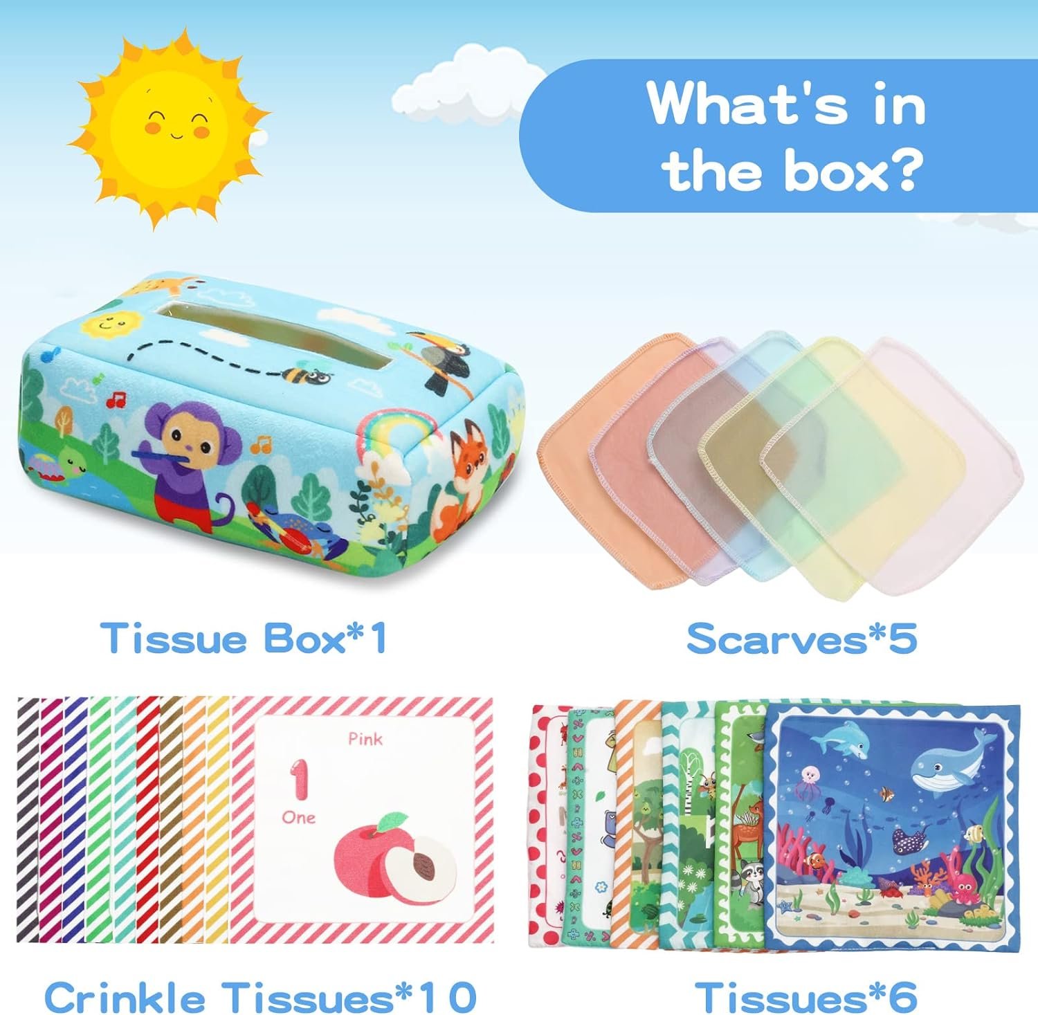 [Colorful Early Learning Toys]: Magic tissue box baby toy come with 6 tissues with animals, insects, marine life patterns,10 tissues with fruits and numbers, 5 solid colorful silk scarves, enlightening babies between 6-12 months early learning and cognitive ability development.