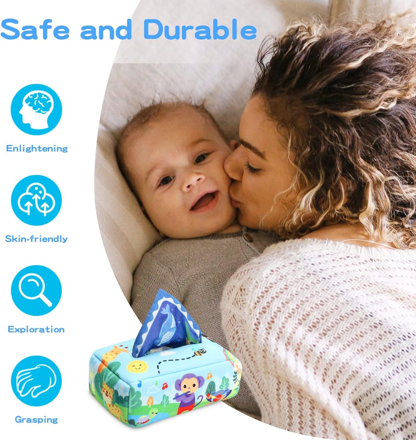 [Sensory Tissue Box Baby Toy]: This baby paper crinkle baby toy perfectly replace the real tissue box. Satisfies the natural curiosity of babies who are constantly pulling out tissues. This Sensory Toys helps babies develop significant fine motor skills, hand-eye coordination and exercise your baby’s ability to focus on one thing.