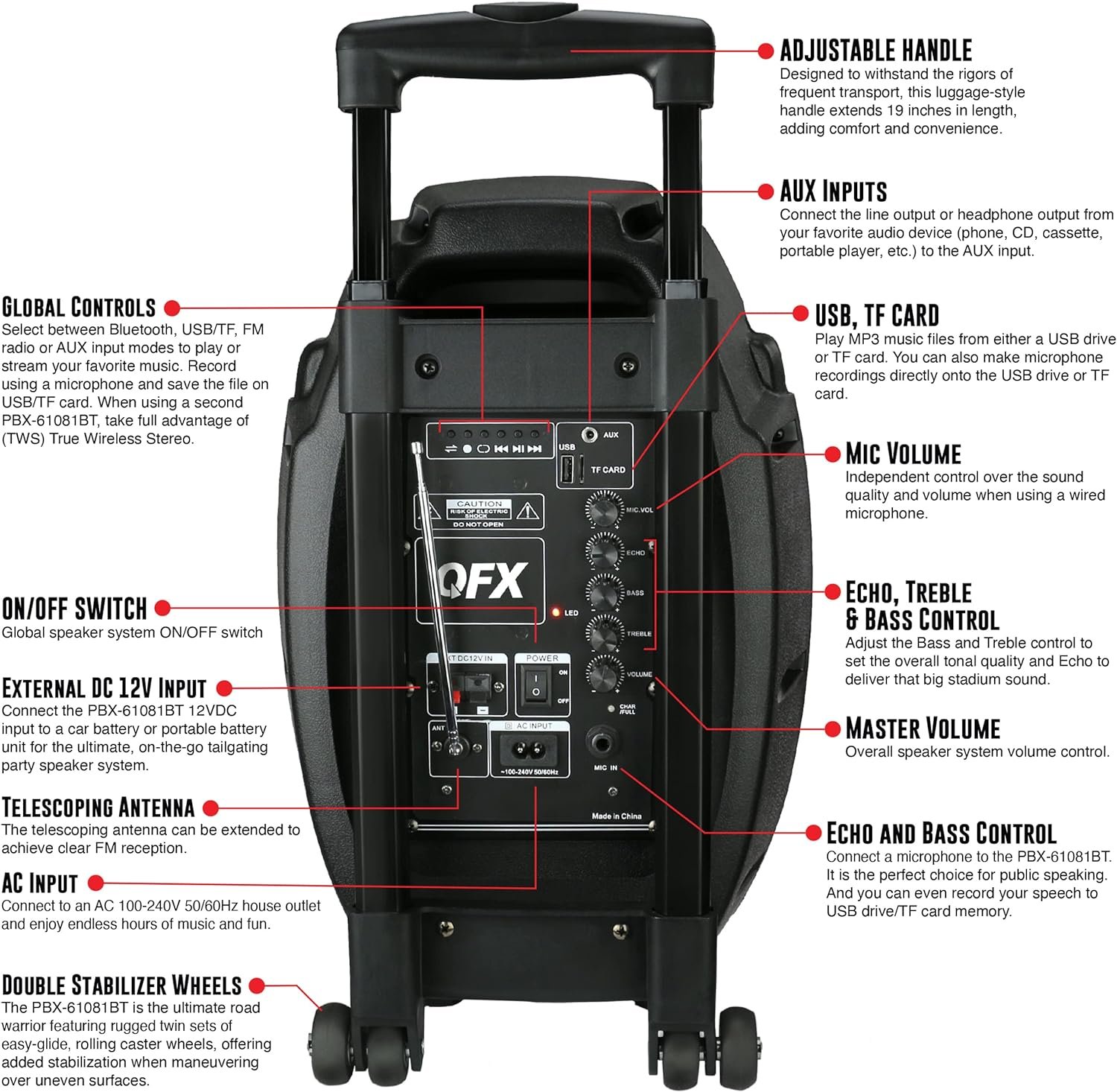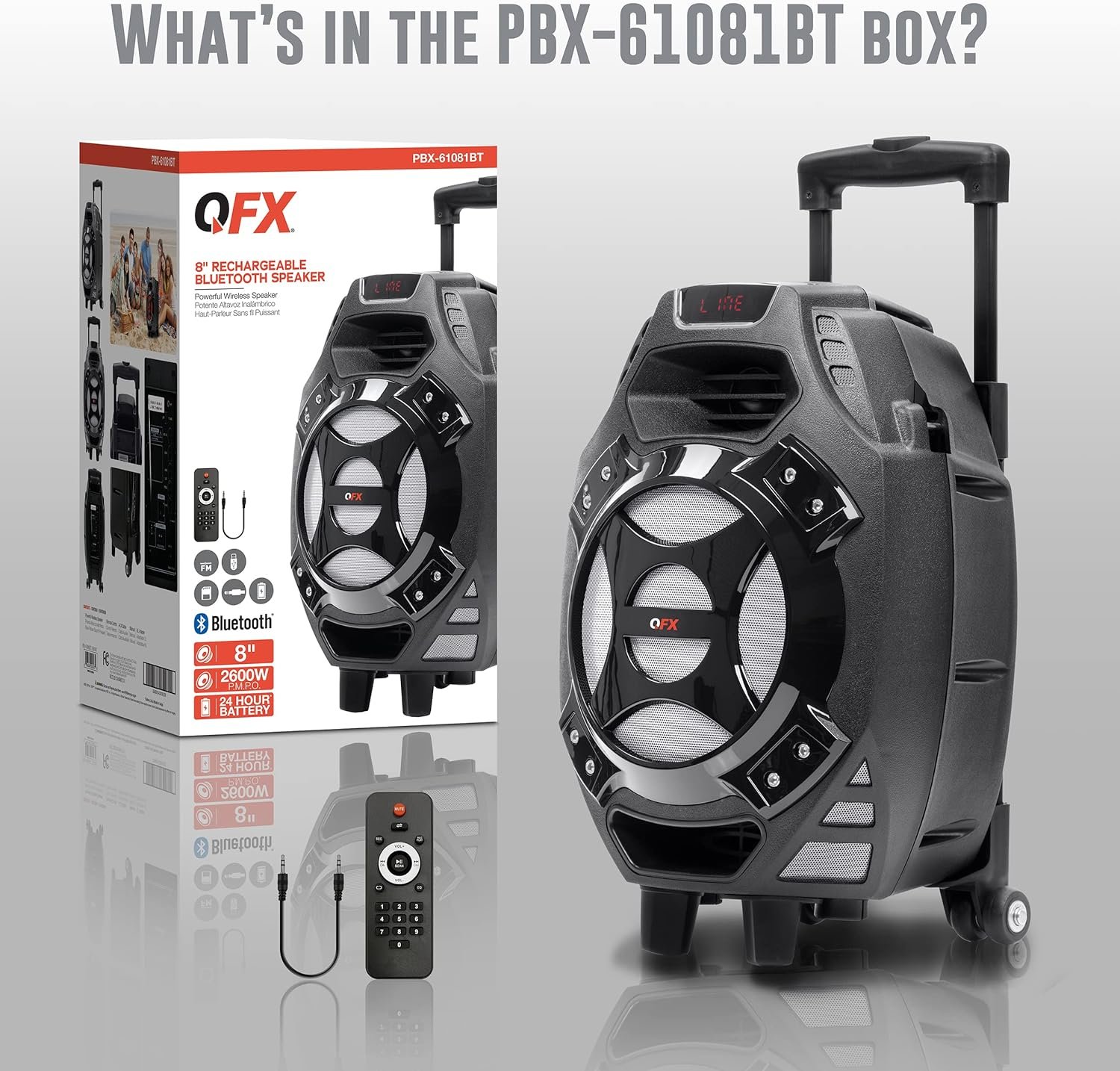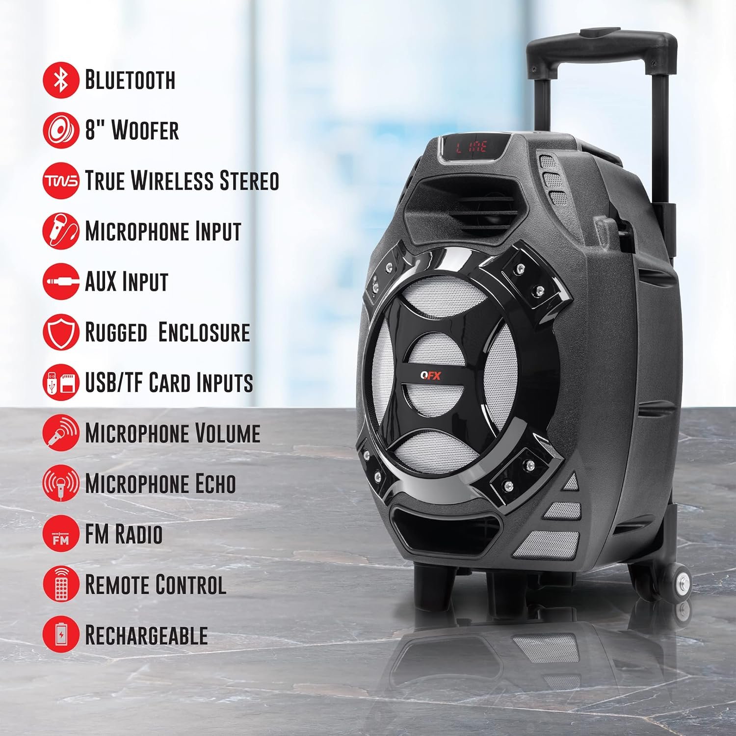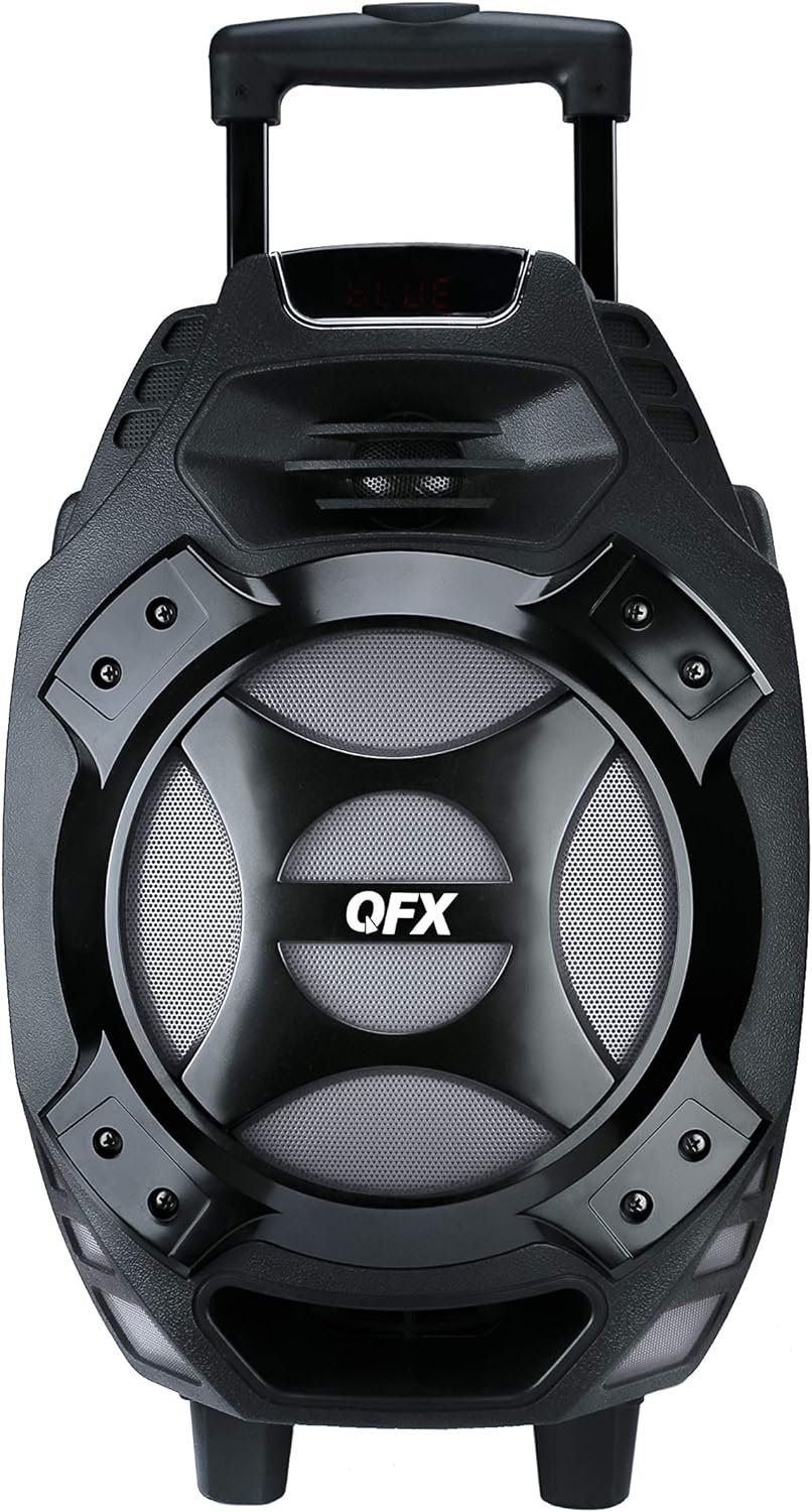 This versatile PA speaker Rolls on in to events to pump out music or amplify announcements. Much like a suitcase It has a handle and wheels so it’ll be easy to transport. Once it’s in place it can stream music from a variety of sources: wirelessly via Bluetooth-enabled devices through USB and SD card slots or connected with a cable through the aux-in port. No matter what you’re playing the speaker’s 8″ Woofer and amplifier ensure that everyone can hear clearly. The rechargeable battery lasts for hours so you can stream music even in places without an outlet nearby. QFX leads the market in lifestyle consumer electronics by delivering innovative product designs and exceptional performance to value-conscious consumers without compromise. With three decades at the frontline of quality electronics QFX stands firm in its commitment to offer the latest in Bluetooth audio tailgating and DJ speaker systems LED T.V.S and many other prosumer multimedia solutions affording budget-focused families businesses and everyone in between industry-leader quality without breaking the bank. From freshman dorm to alumni tailgate party from first apartment to family home QFX has the gear you need at the price you want