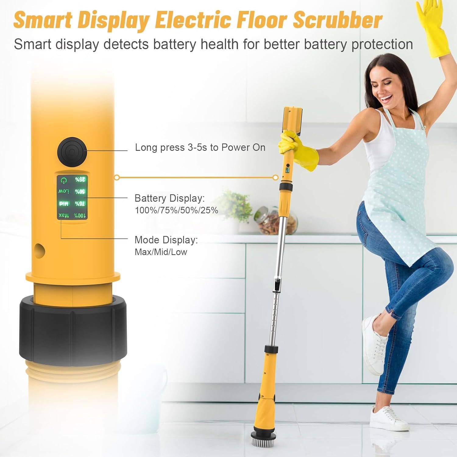 【𝐇𝐢𝐠𝐡 𝐑𝐏𝐌 𝐚𝐧𝐝 𝐄𝐱𝐜𝐞𝐥𝐥𝐞𝐧𝐭 𝐇𝐞𝐚𝐭 𝐃𝐢𝐬𝐬𝐢𝐩𝐚𝐭𝐢𝐨𝐧】Battery electric spin scrubber has 800 RPM/1000 RPM/1200 RPM three power modes, especially MAX mode, the power is very strong, originating from the use of a double-bearing rotary and 20V high-power battery (other scrubber power only 600 rpm). The new heat dissipation material shell can not only effectively emit heat, but also reduce the noise when used. Note: Turn on Max mode, please hold the handle of the battery electric spin scrubber firmly.