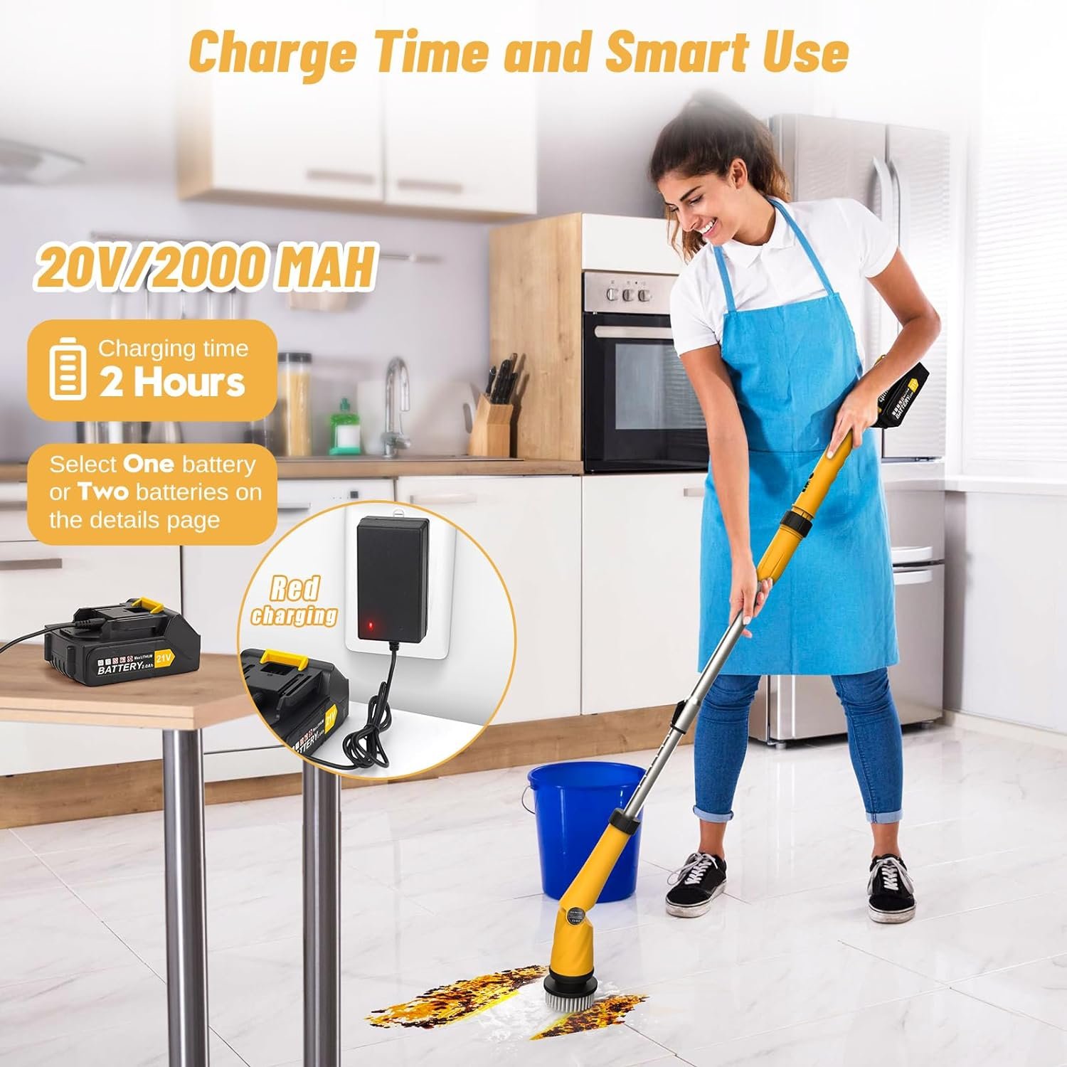 【𝐁𝐚𝐭𝐭𝐞𝐫𝐲 𝐜𝐚𝐩𝐚𝐜𝐢𝐭𝐲 𝐚𝐧𝐝 𝐜𝐡𝐚𝐫𝐠𝐢𝐧𝐠 𝐭𝐢𝐦𝐞】The cordless battery electric spin scrubber is equipped with a removable 20v high-power battery with a capacity of 2,000 mAh, which is fully charged in 2 hour and can work continuously for 2.5 hours (low speed mode). Enough for a deep cleaning job for your floor or bathroom. When the charger is red, the battery is charging. When the charger is green, the battery is fully charged. Note: Battery display only detects battery health, does not light up when charging.