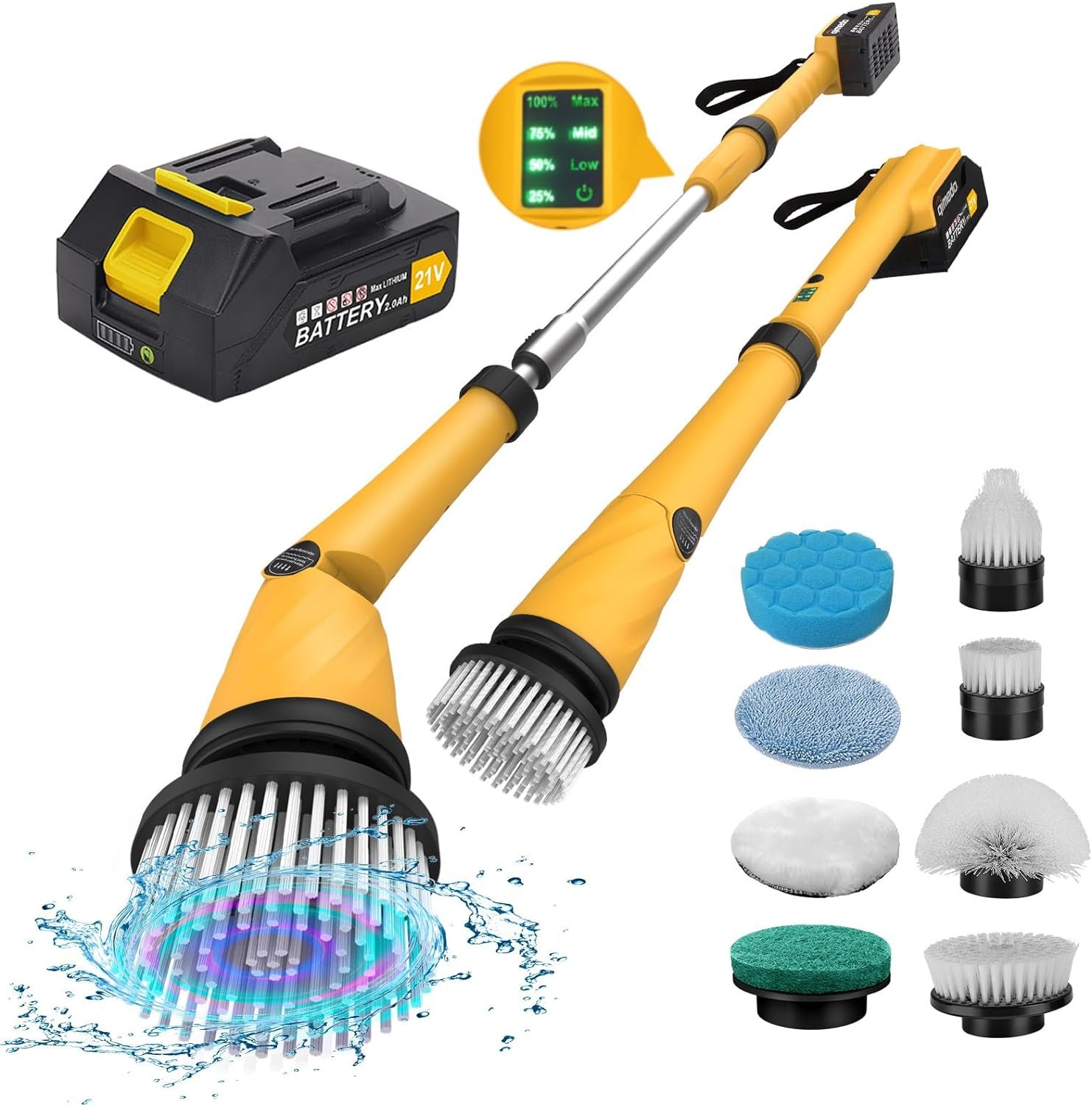 【𝐀𝐝𝐣𝐮𝐬𝐭𝐚𝐛𝐥𝐞 𝟓𝟎-𝐢𝐧𝐜𝐡 𝐡𝐚𝐧𝐝𝐥𝐞 𝐚𝐧𝐝 𝐛𝐫𝐮𝐬𝐡 𝐡𝐞𝐚𝐝】The electric tile scrubber consists of a brush head, telescopic pole, and a battery handlebar. The cleaning brush head runs in the opposite direction of the electric tile machine, so it’s more stable and you don’t have to worry about dropping it. The telescopic pole extends an additional 10 feet when held down, and the brush head can be adjusted 45° so you can easily clean walls or floors without bending over or stretching your arms.