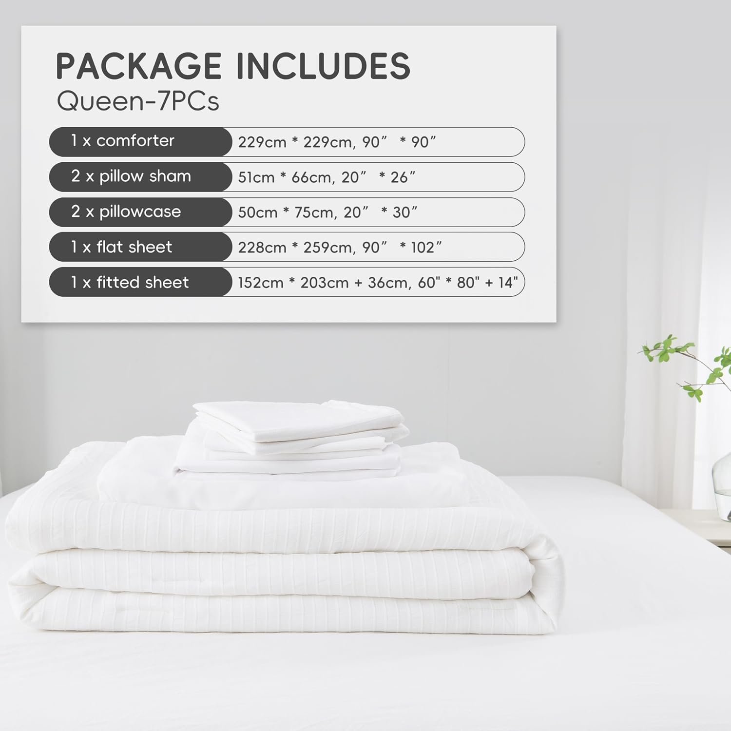 Package Includes – Queen Comforter Set-7PCs, 1 x comforter (264cm*229cm, 104”* 90”), 2 x pillow sham (51cm*92cm, 20”*36”), 2 x pillowcase (51cm*102cm, 20”*40”), 1 x flat sheet (275cm*259cm, 108”* 102”), 1 x fitted sheet (198cm*203cm + 36cm, 78”* 80”+14”).