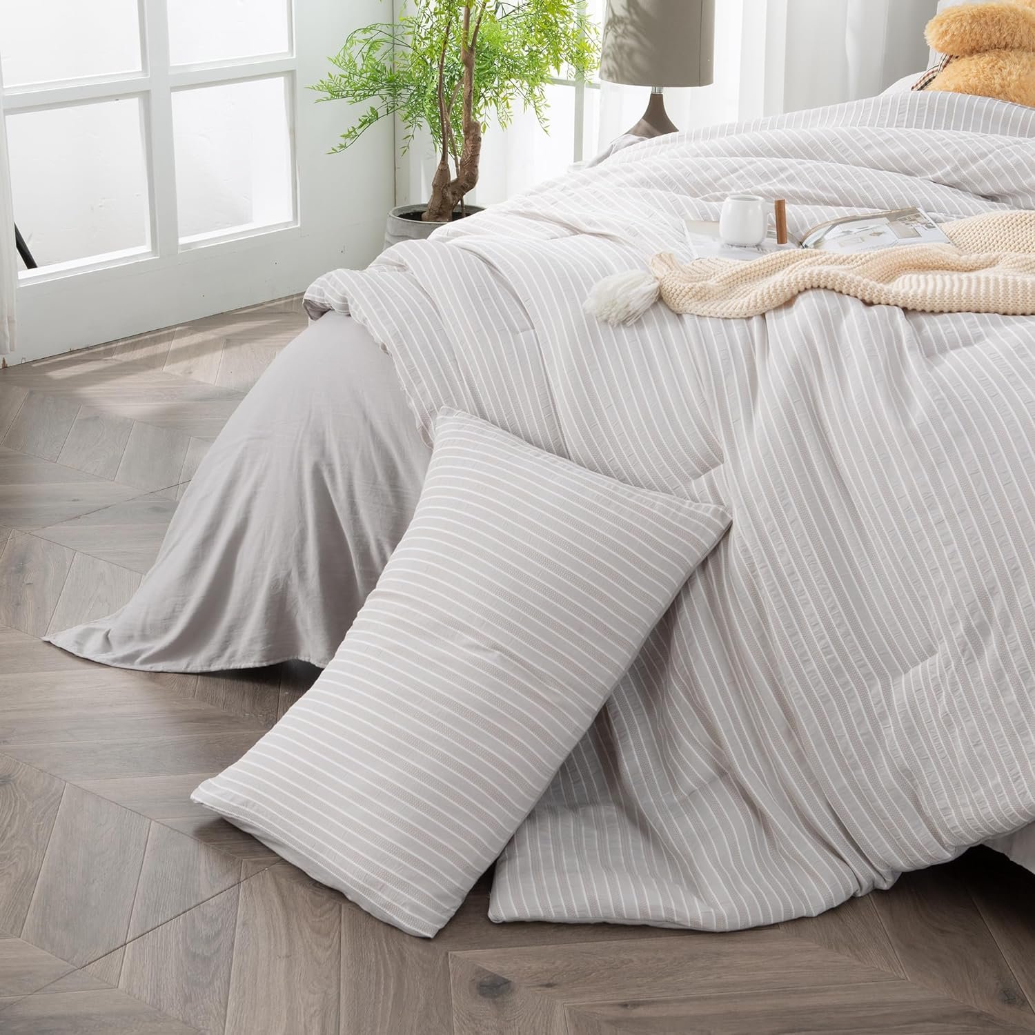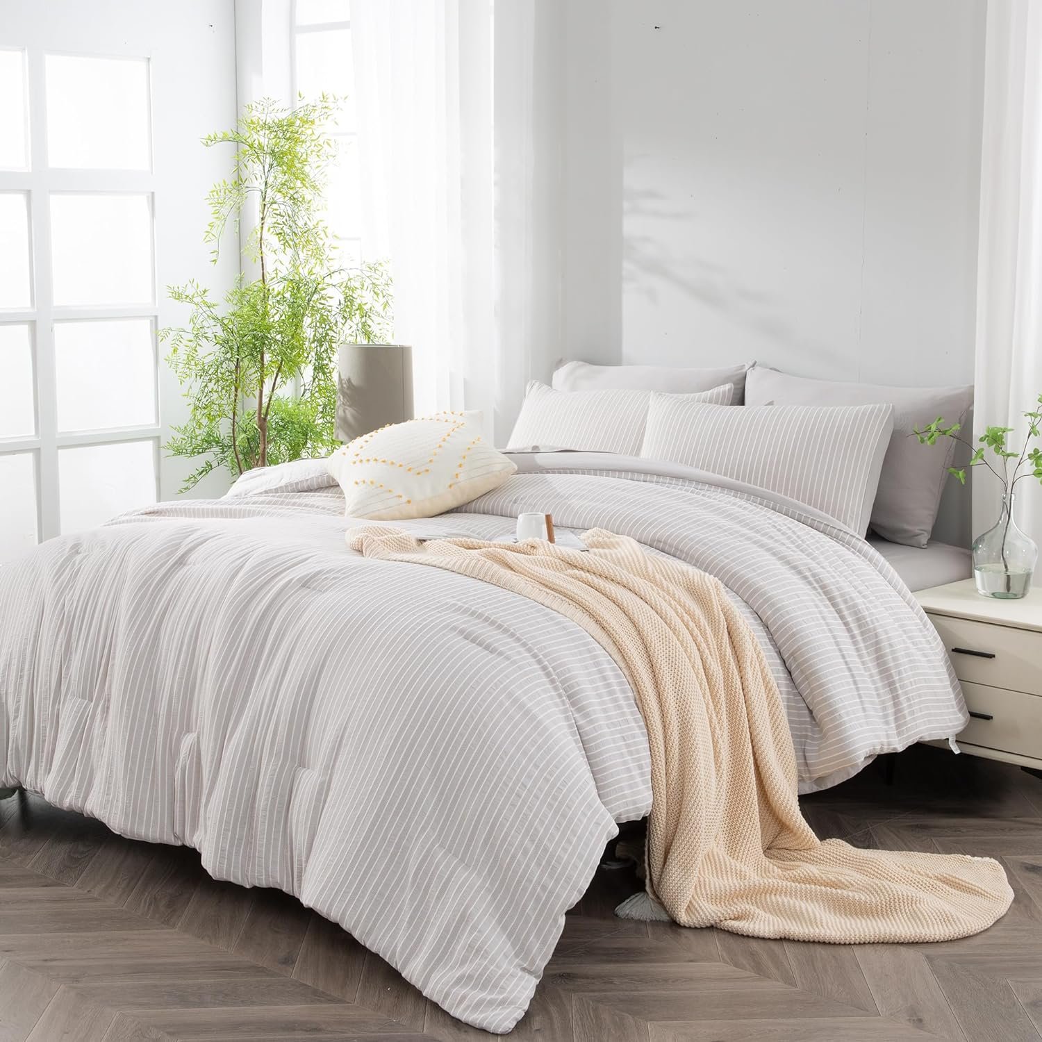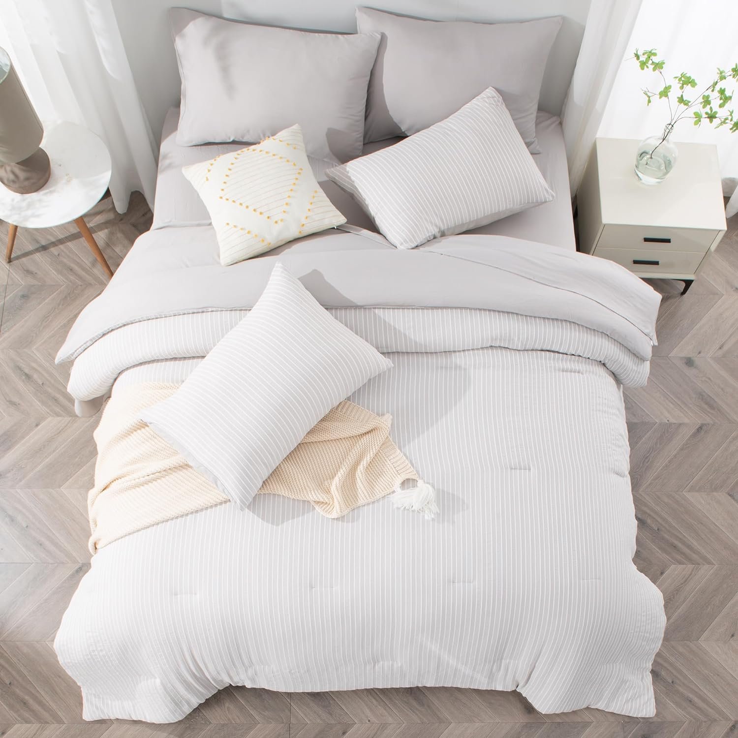 Year-Round Versatility – Our jacquard striped queen bedding set brings comfort and style all year round. With its 7-piece design, it offers protection and coziness in every season, from summer to winter. Perfect for your bedroom, guest room, or holiday retreat, it not only ensures practical comfort but also refreshes your space with a chic look. Elevate your living area with this versatile and stylish grey queen comforter set.