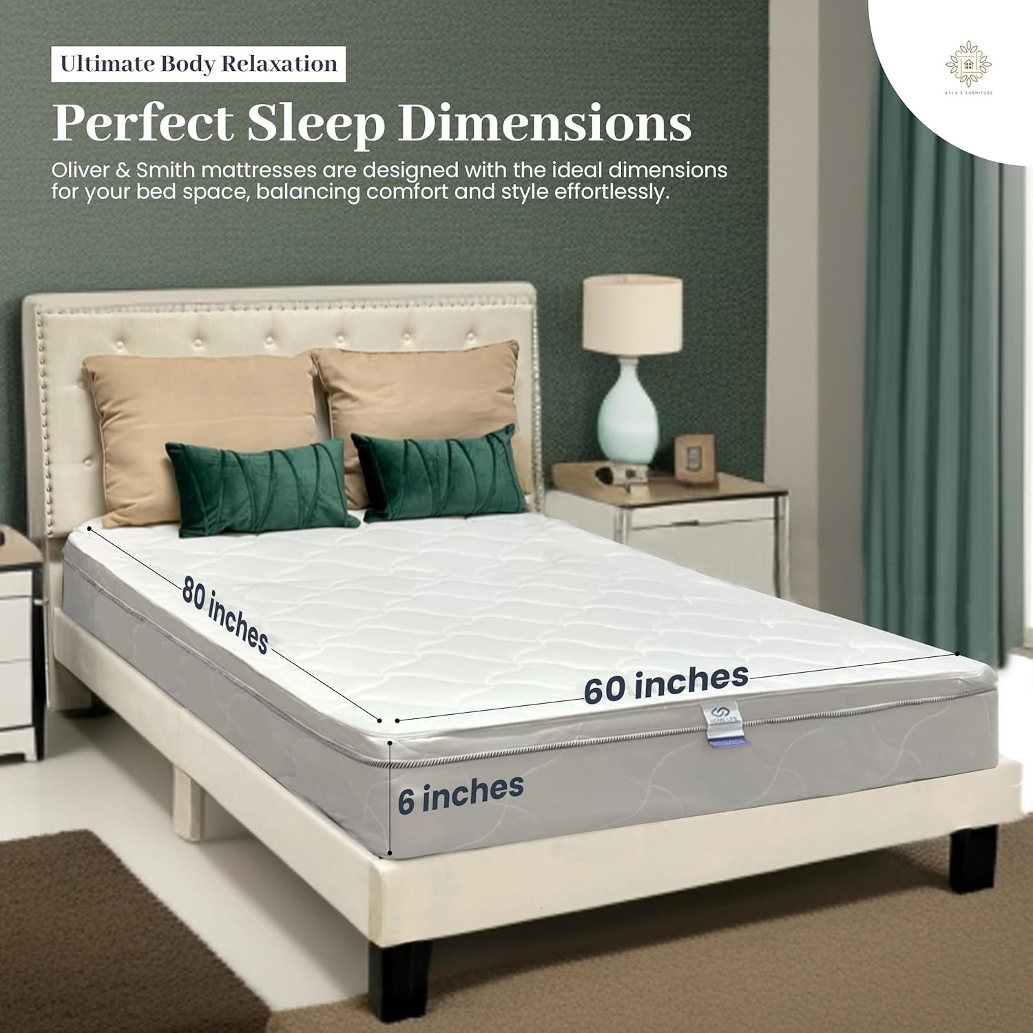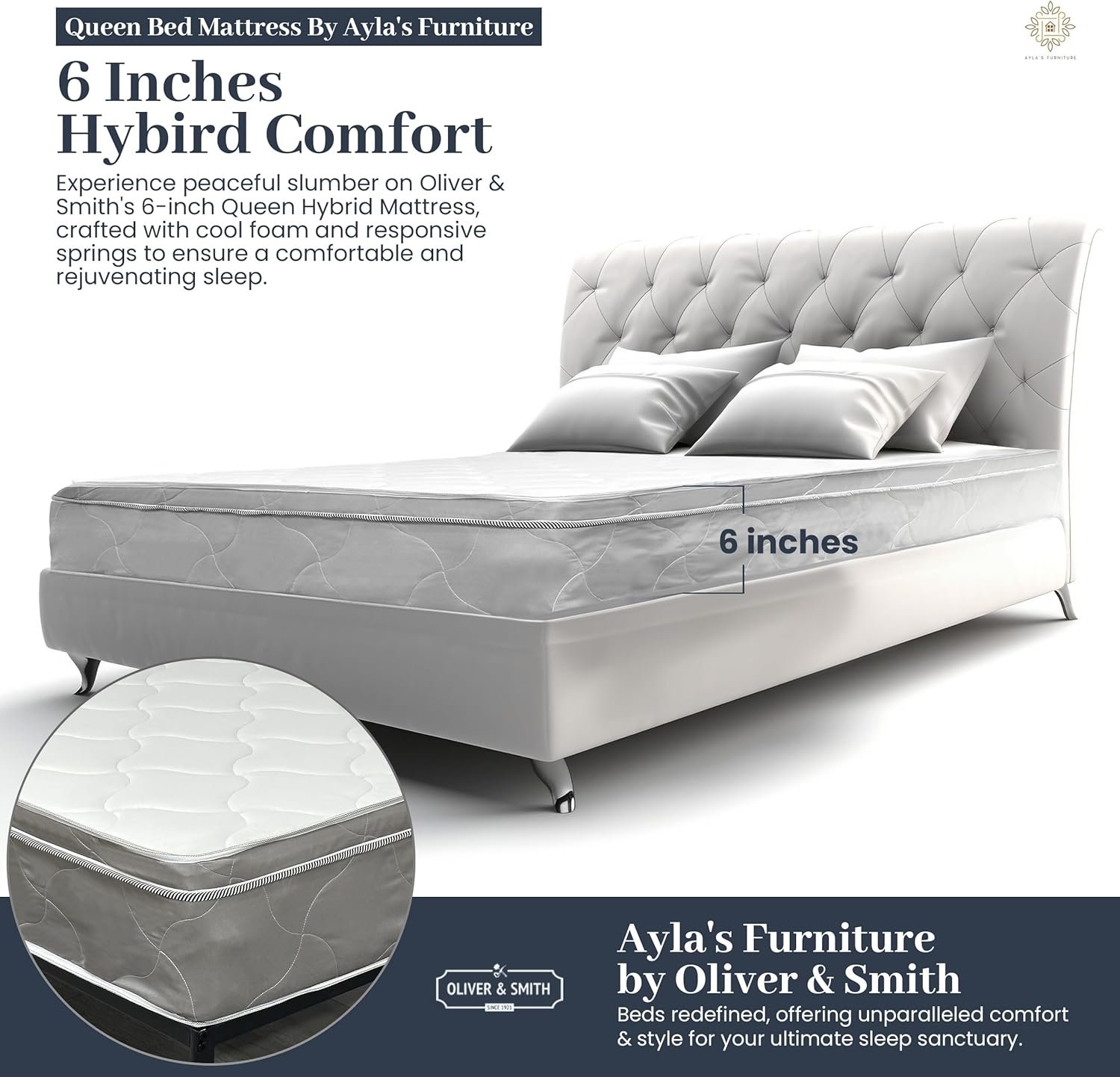 🌟 6-INCH HYBRID COMFORT: Sink into blissful slumber on our 6 inch Hybrid Mattress Queen by Oliver & Smith (made with 3 layers: comfort foam, high-density foam, and Bonnell coil springs, seamlessly blending premium cooling foam and responsive spring support. With our exceptional bed mattress queen, which comes either in white or gray color, you can relish pressure relief, ensure uninterrupted sleep, and wake up rejuvenated every morning.